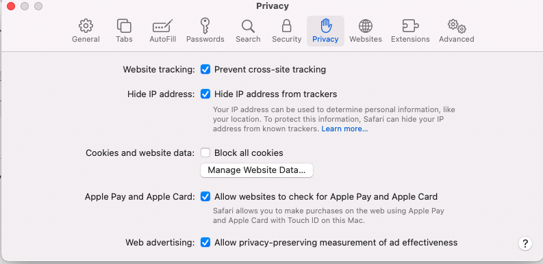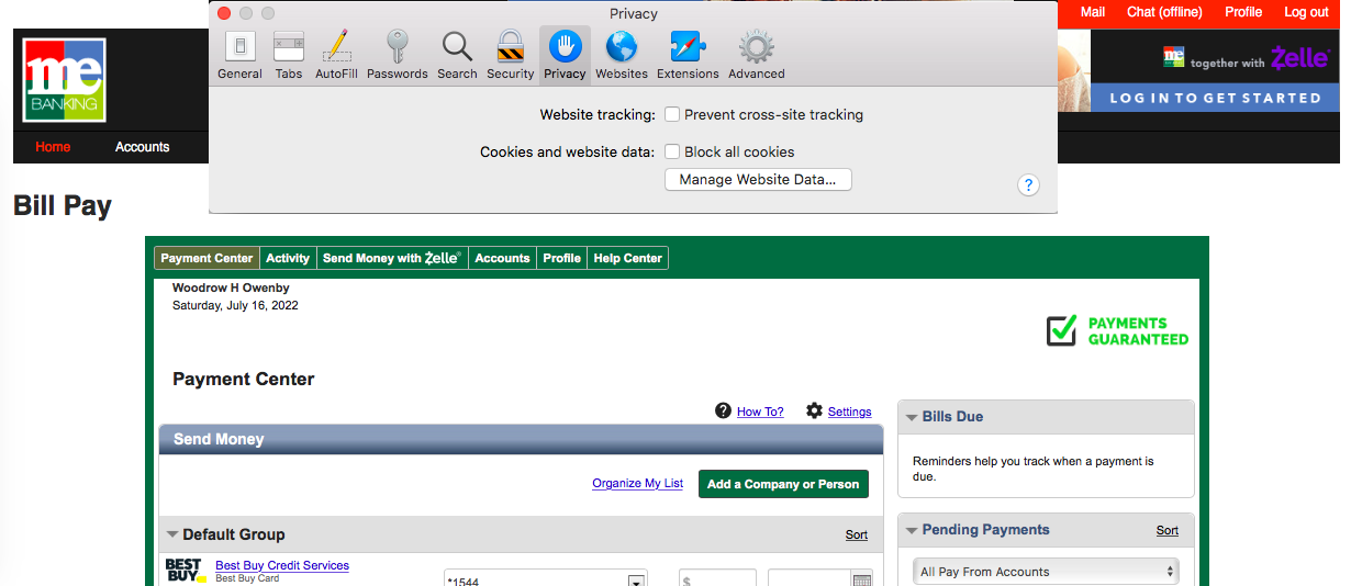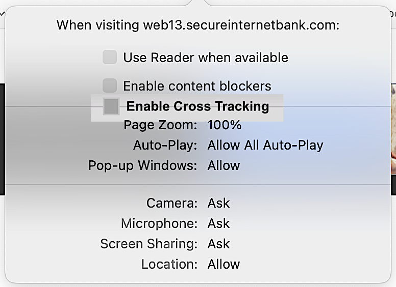 The banking website display The message to "allow cookies, popups and site cross tracking" to enter Bill Pay on the site; actually bill pay is not on the same domain so BILL PAY is selected cross tracking blocks BILL PAY. I don't really do programming so I don't know if APPLE could add the option to allow cross tracking to the settings on the Safari tab "Setting for...." Google seems to have figure how to allow it in Chrome and Brave allows you to toggle it off and on by the address bar without having to navigate to preferences.