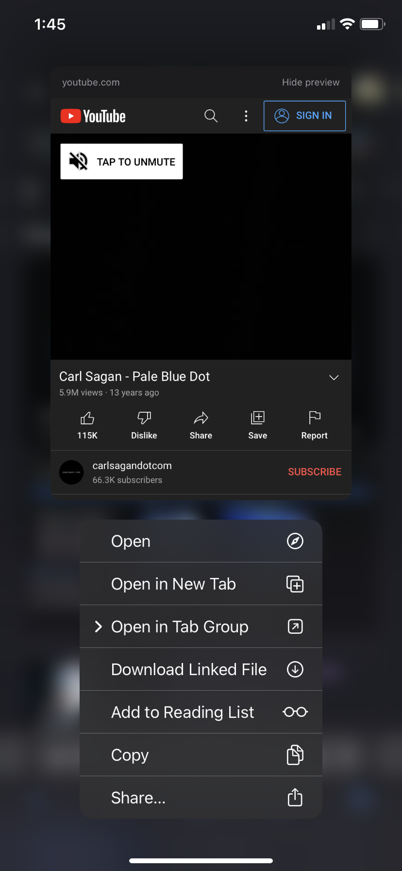 I've seen solutions saying "hold the link and tap 'open in youtube'" but I don't see any option for that when I hold the link. (See attached image)