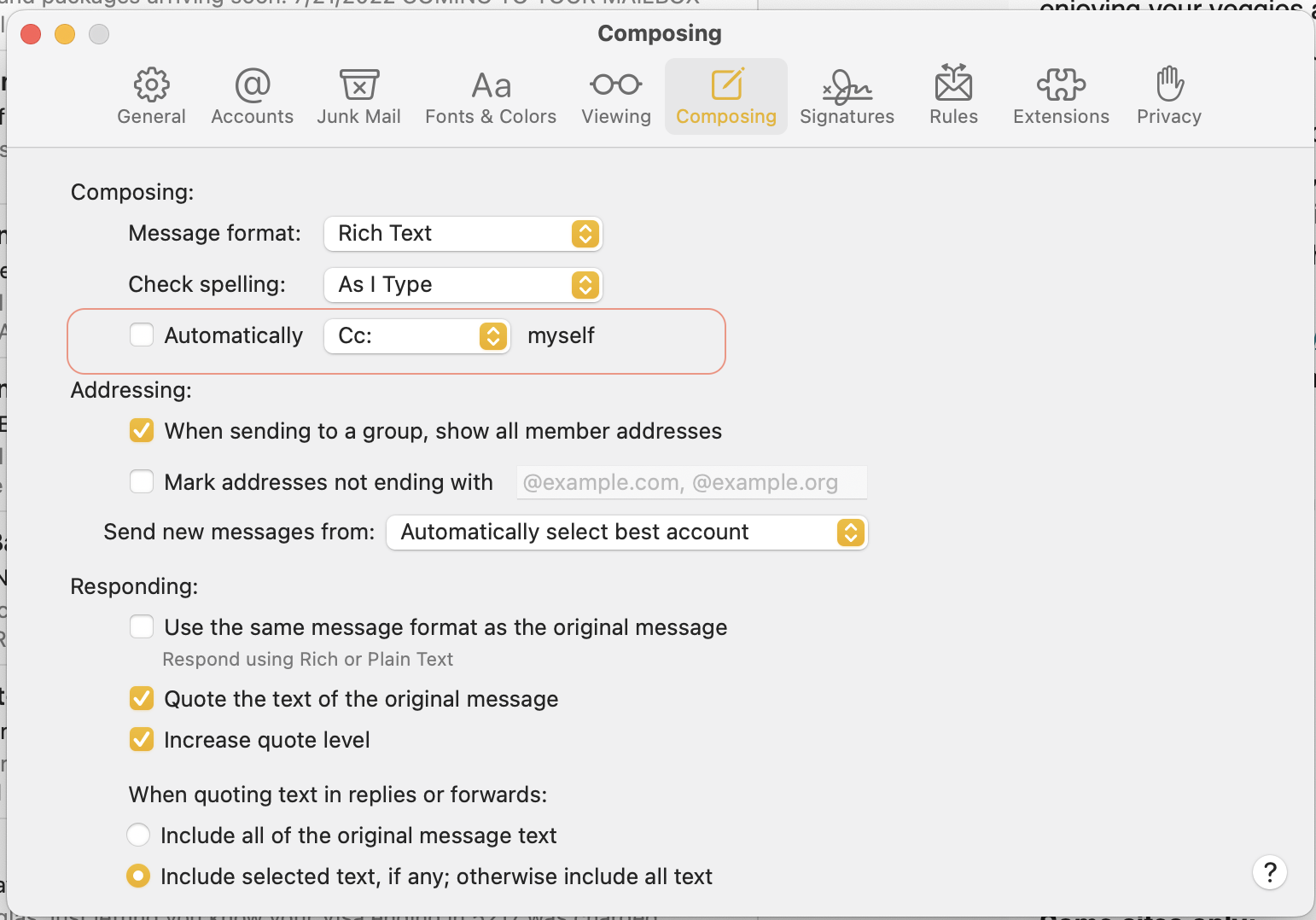 I noticed today that when I send an email, I get a copy sent to me. I checked the settings and don't see anywhere well this is enabled. My emails are hosted by Google, and I also checked those settings and don't see anything void this should be happening