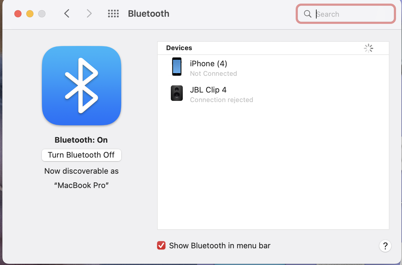 Hi! First time using this! I cannot get my JBL Clip 4 to connect to Bluetooth on my Macbook Pro. Each time I try to connect, it says "Connection rejected", and I have no idea what to do. I have Monterey 12.5, and this was an update that was done 20 minutes before I attempted to connect. The same thing happened, however, prior to the update. I have included a screenshot here because I thought that might be helpful. Having read countless inquiries on this Apple Support Community, I know that being thorough--being as complete as possible--is appreciated, so I have tried to include as much information as I can. Thanks in advance for whatever help you might be able to give!
