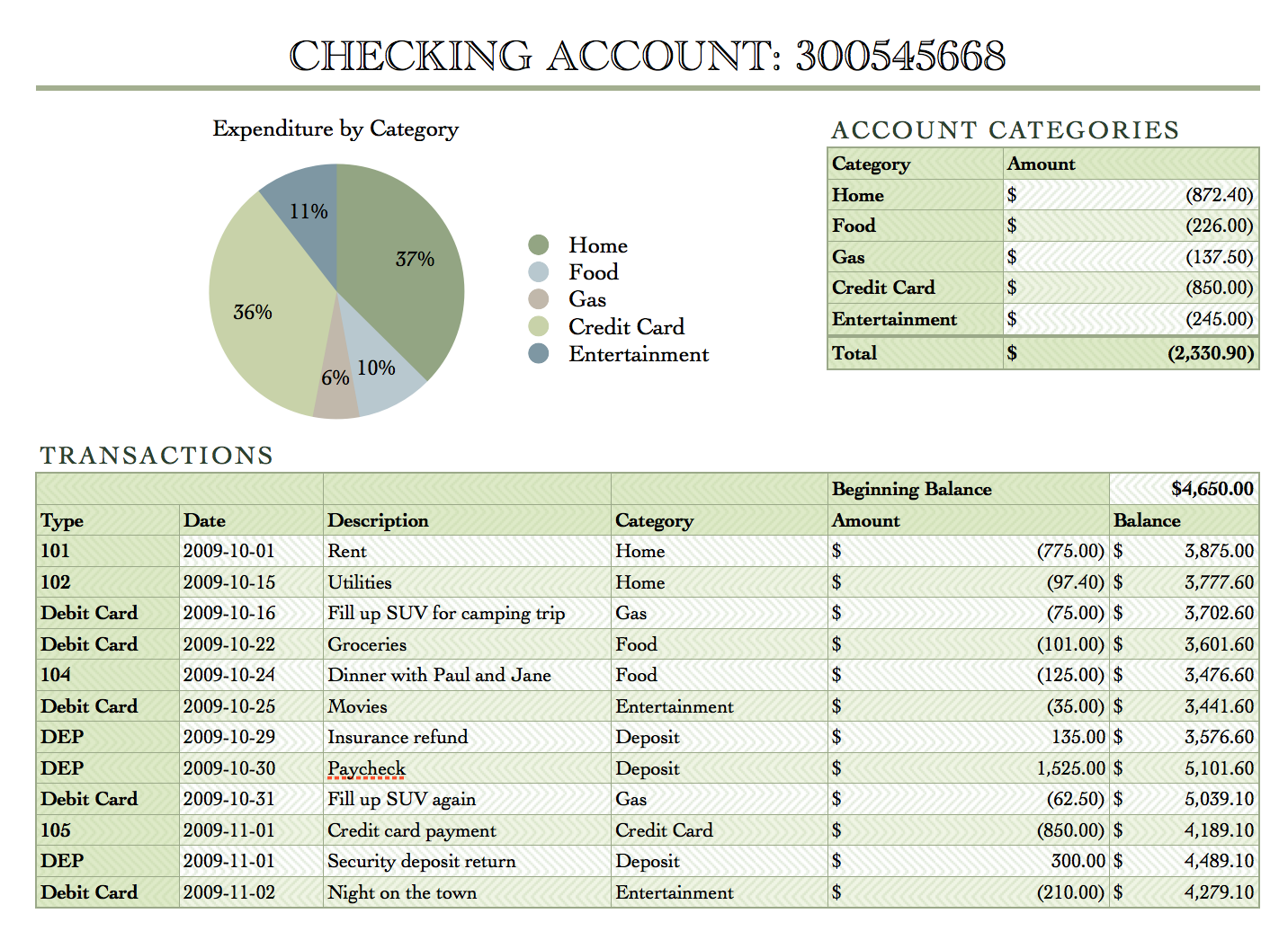 Type lists the payment method for each amount, using cheque numbers to mark a payment by cheque, Debit Card for a purchase done with a debit card and DEP for any payment into the account.