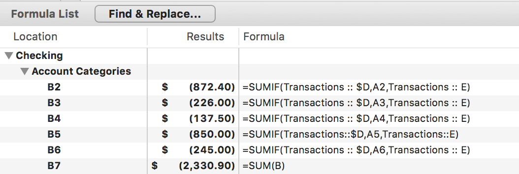 The first, which sums a single category, is entred as shown in Account Categories::B2 and filled down to row 6.