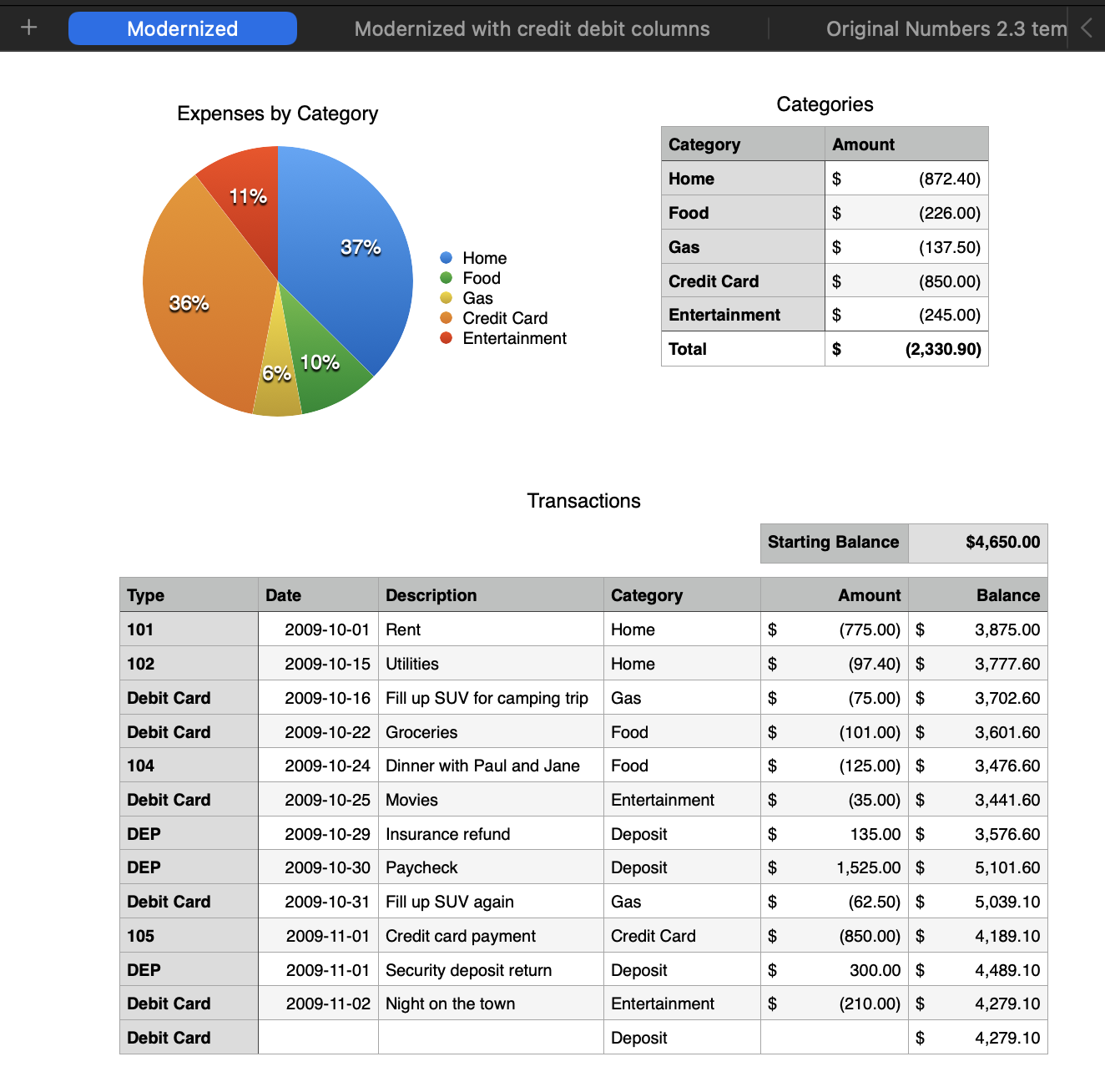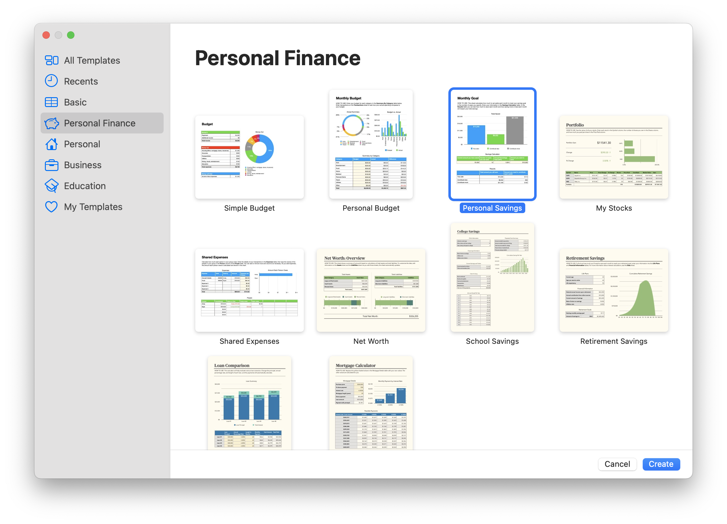 When you create a new Numbers document using the Numbers menu item "File > New…", you get a dialog that lets you choose a starting template. I suggest trying the "Personal Savings" template: