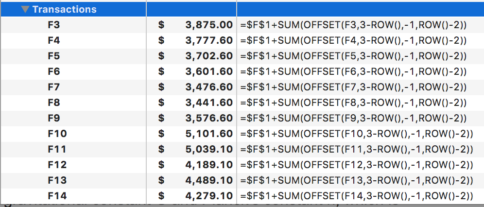 The Transaction table contains one formula, entered as displayed at the top of the list below in cell F3, then filled down to the last cell in that column.
