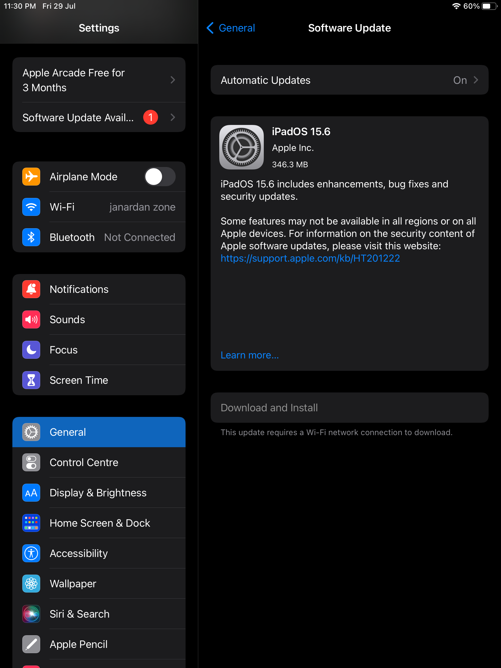As mentioned in the image the download and install option is not showing here although there is cen IPad Os update of 15.6. Also there is a problem with Wi-Fi icon as it is not in the top right corner.