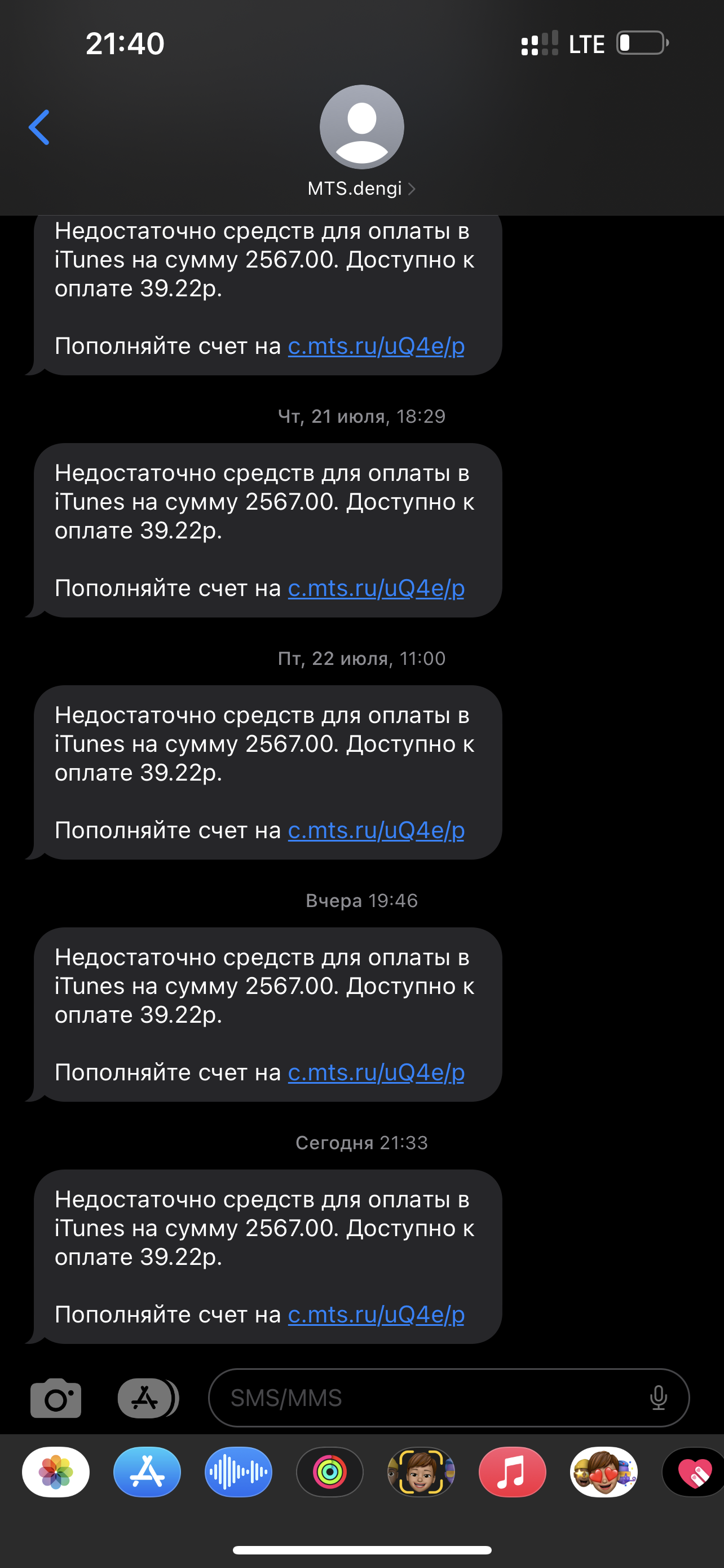Добрый день/вечер. Мне в течении нескольких дней приходит сообщение с iTunes, что у меня не хватает денег для оплаты какой то подписки. Пополняю iTunes через мобильный телефон, вот номер +79182927494.