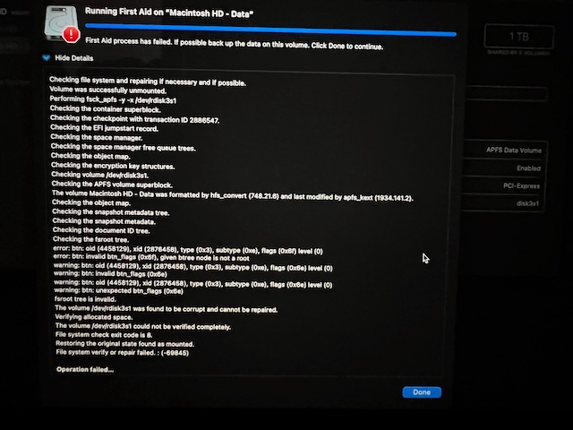 The error is: "Volume Hash Mismatch. Hash mismatch detected on volume disk1s5. MacOS should be reinstalled on this volume".