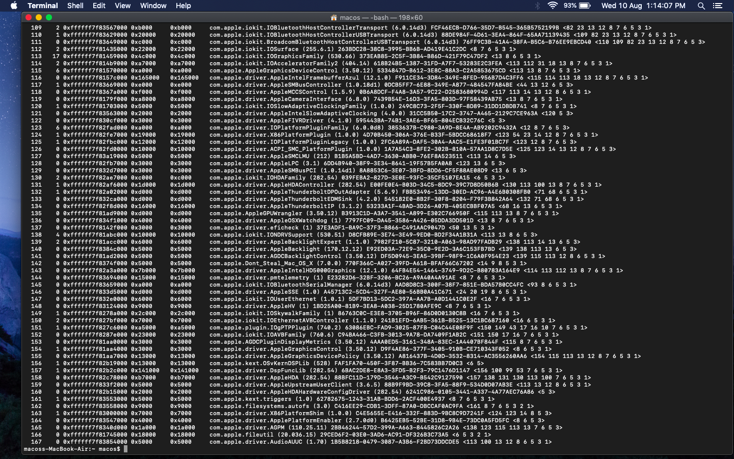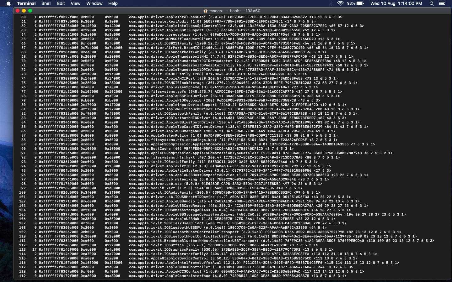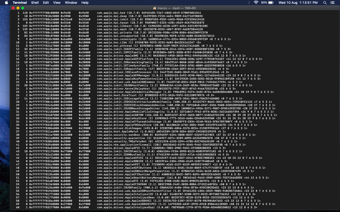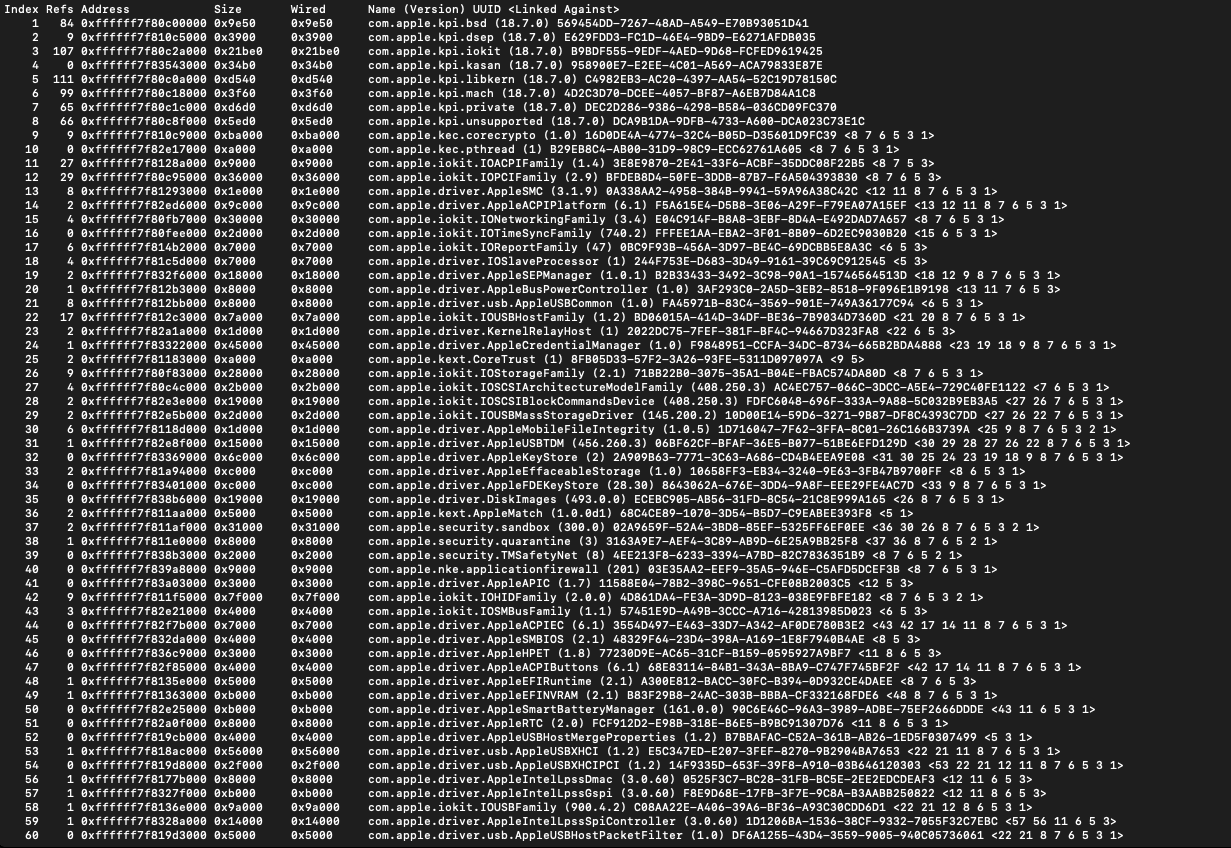and a screenshot of "kextstat" command in safe mode and in normal mode
