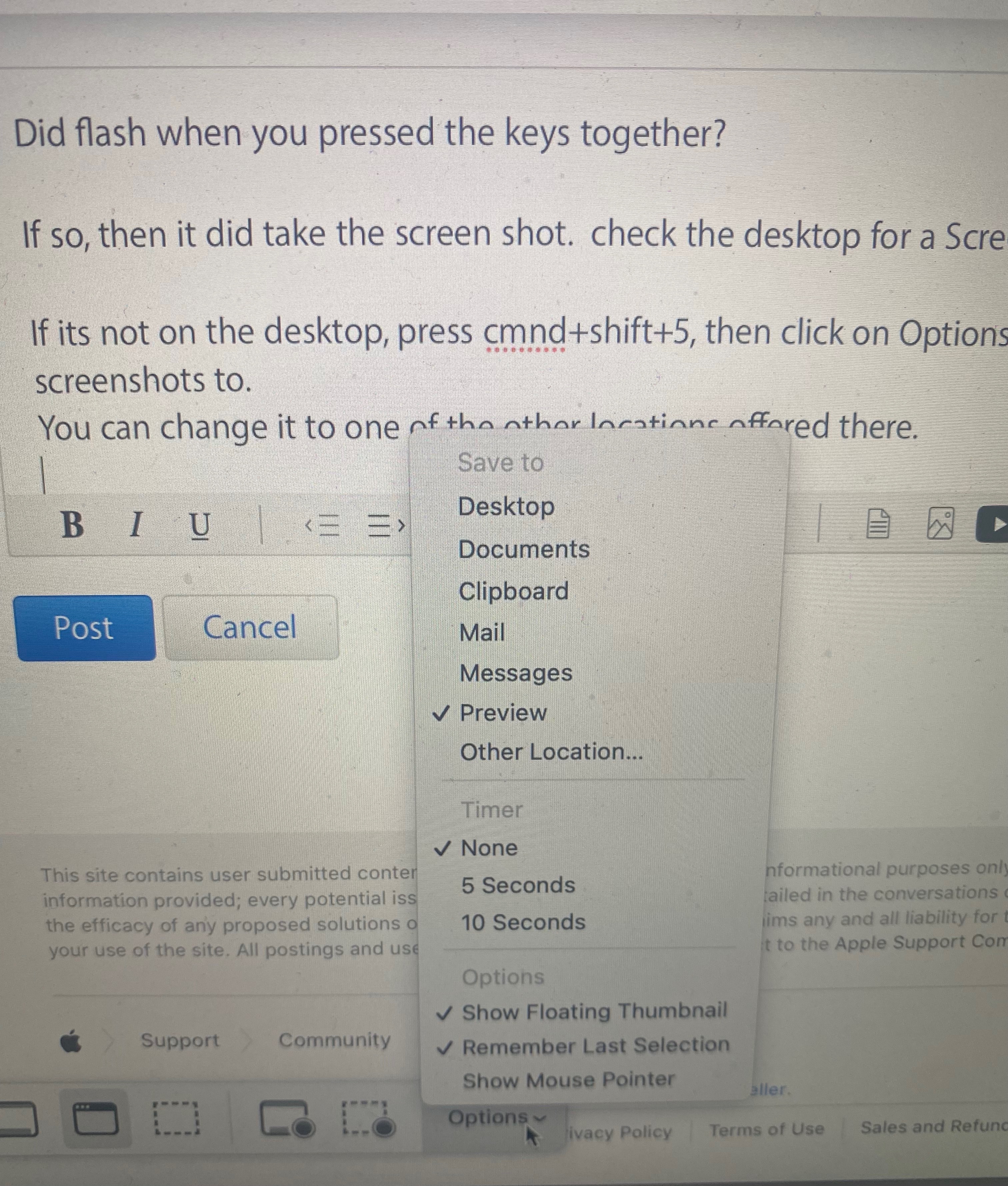 If its not on the desktop, press cmnd+shift+5, then click on Options in the control bar that appears and see where its saving the screenshots to.