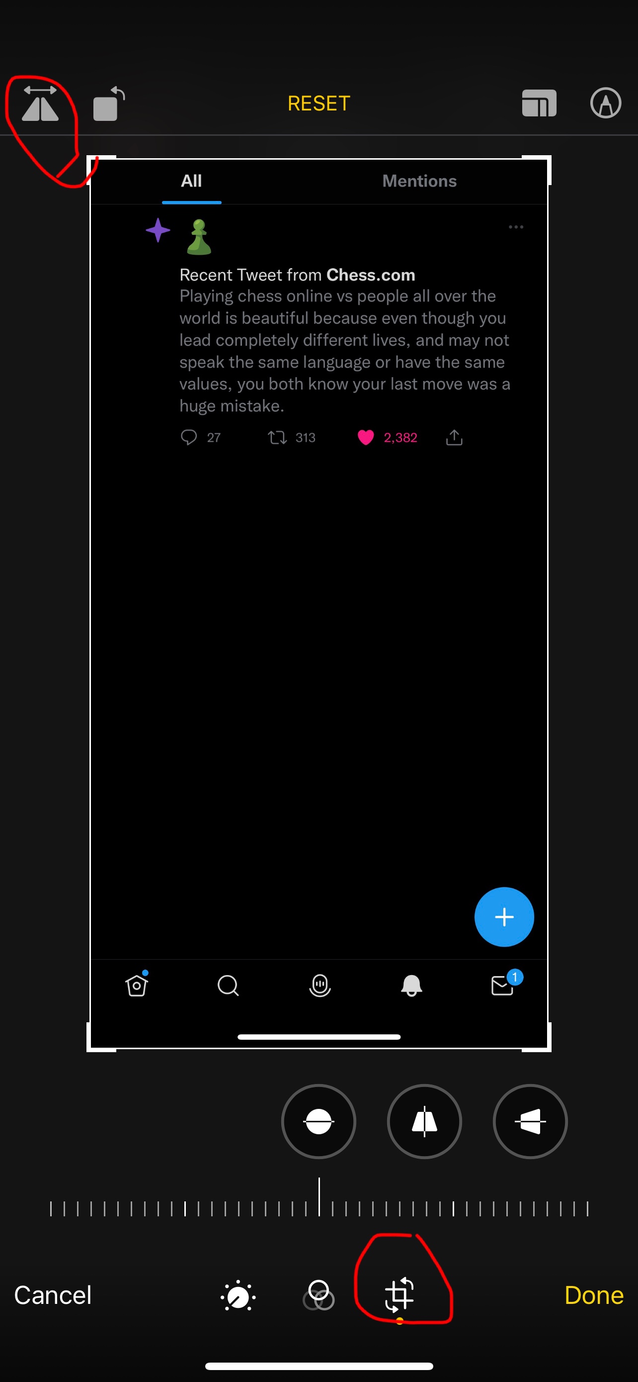 You can use the flip button using the crop and straighten tool in Photos. On iPhone, open Photos. Open a photo. Click the crop and straighten tool. Then click flip.