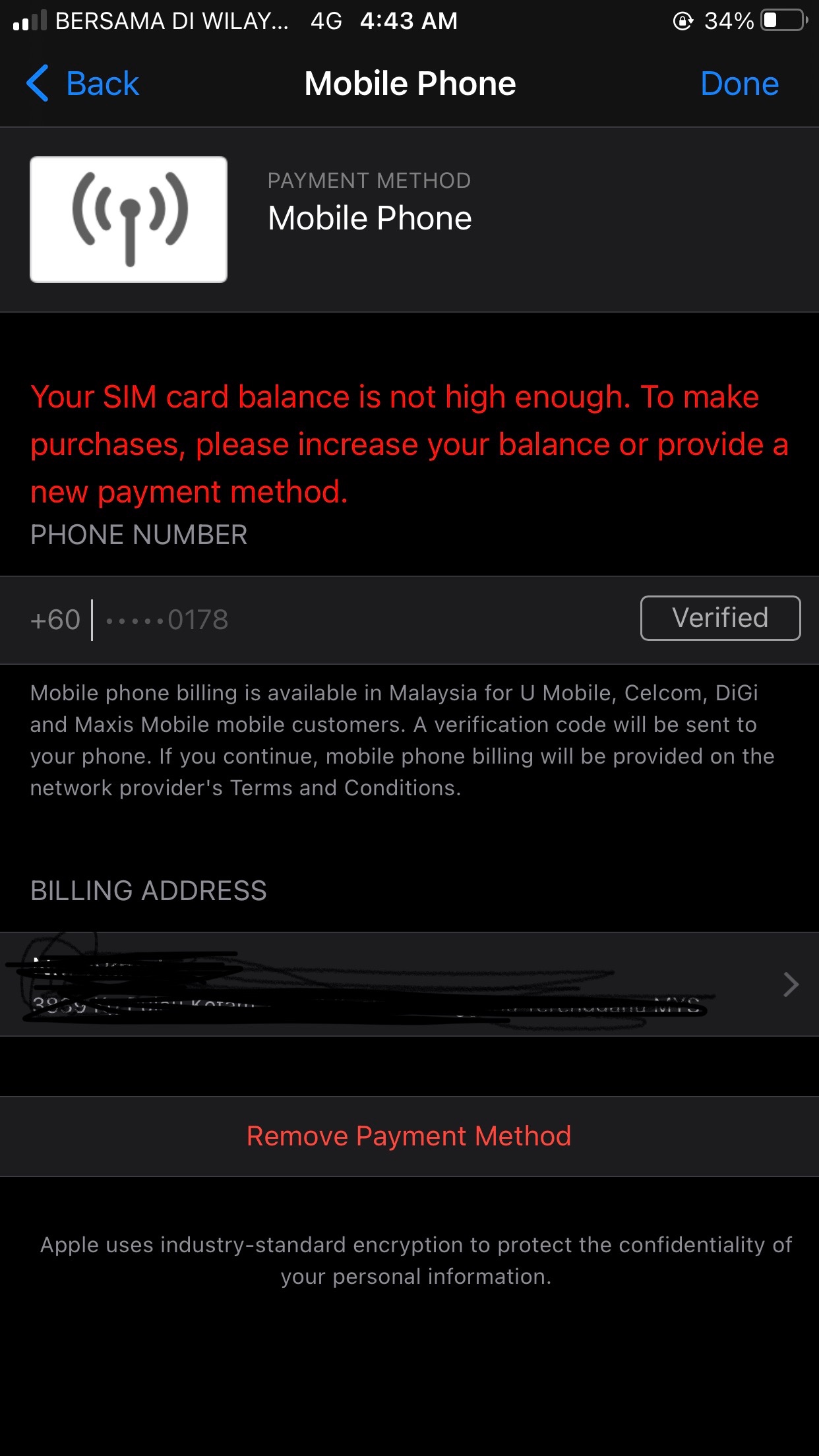 According to the image you posted, your telephone number has been verified, but you do not have enough funds posted to your SIM card to make any purchases. Also, Bersama di Wilayah is not listed as one of the carriers participating in this payment scheme, though parent Celcom is. Please contact Bersama di Wilayah Customer Service to get help.