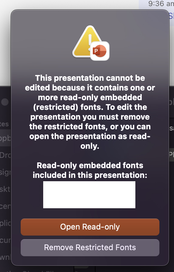 Anyone else encountering a Restricted Font issue on Microsoft Powerpoint which has only arisen in the past month? We've been using a custom font for a corporate client for the last 2 years without any issues but as of about a month ago, Powerpoint has started flagging that the font as 'restricted' and the file (which I created) is now only 'Read Only'. I am given the option to remove the restricted fonts (defaults to Calibri) and open an editable version of the file but this is not possible as we need to use this font. We've tried updated operating system to the latest OS Monterey (previously on Big Sur). Powerpoint is also updated to the latest version 16.63 and no luck. The strangest thing is that sporadically, the font will work, but most of the time, it shows the issue below. (Sorry for confidentiality, I had to cover the font names). We've found that the issue doesn't arise on old versions of PPT (like 2016) but thats no good to us either.