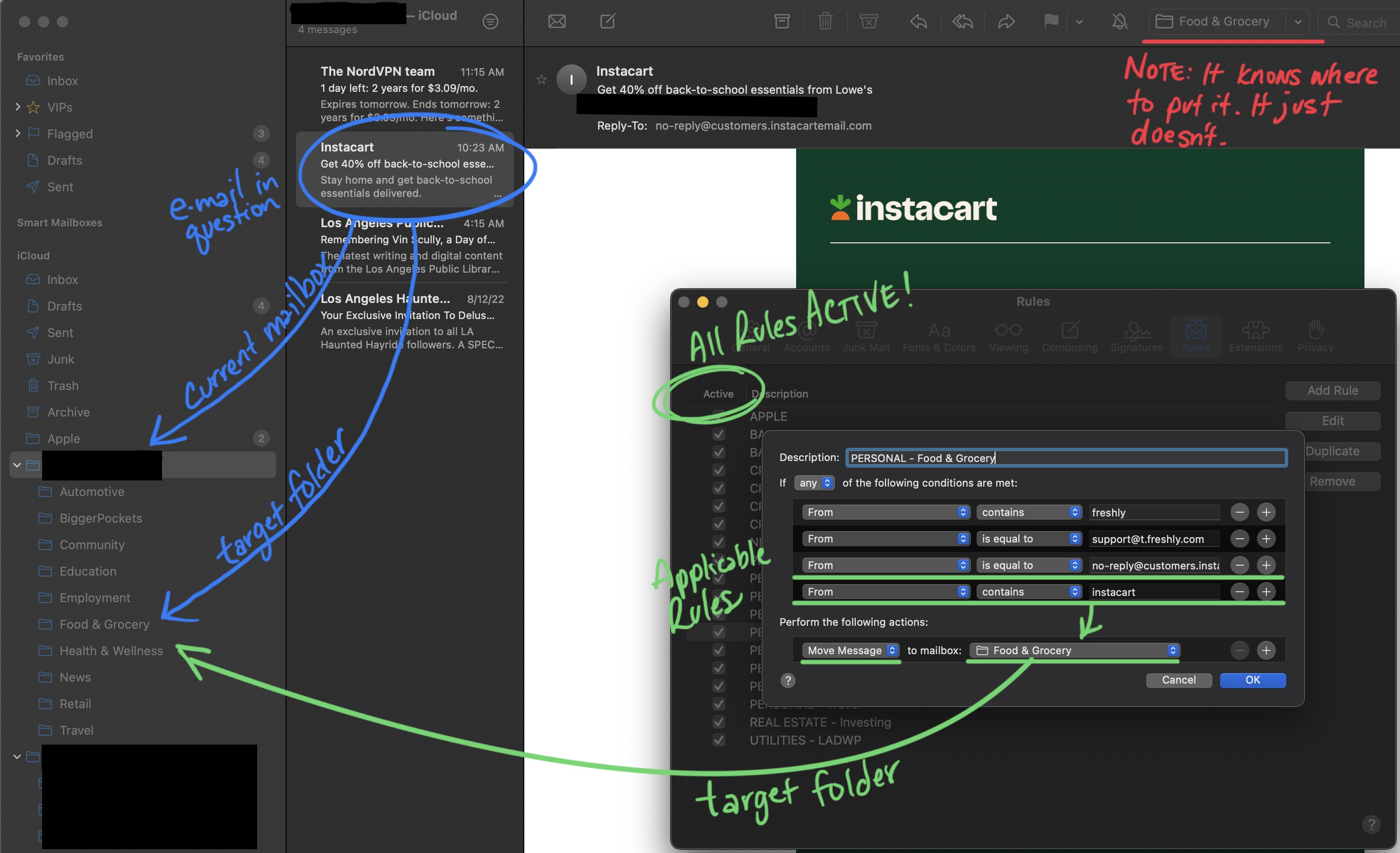 - Mail is currently running with new e-mails arriving, i.e. the e-mail rules aren't missing the e-mails because Mail is inactive.