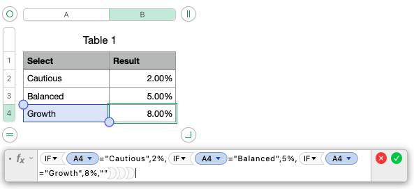 =IFS(A1="cautious",2%,A1="balanced",5%,A1="growth",8%,TRUE,"")