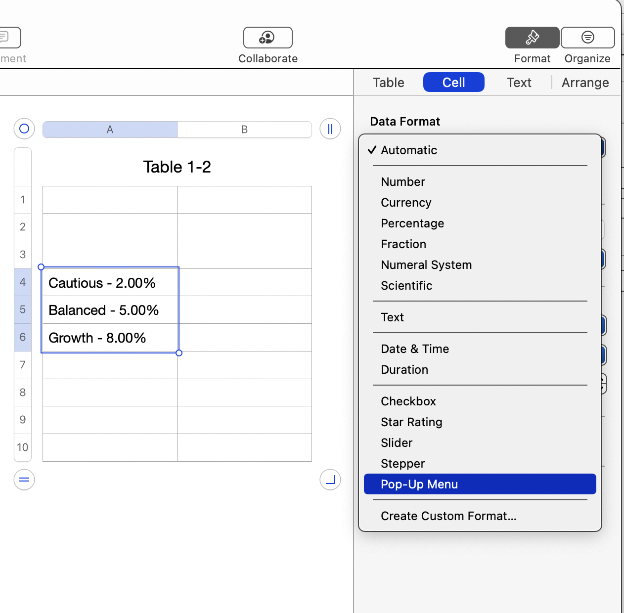 E.g. If Cautious is selected in the pop up menu in cell A1, I would like cell B1 to automatically fill with the percentage 2.00%.