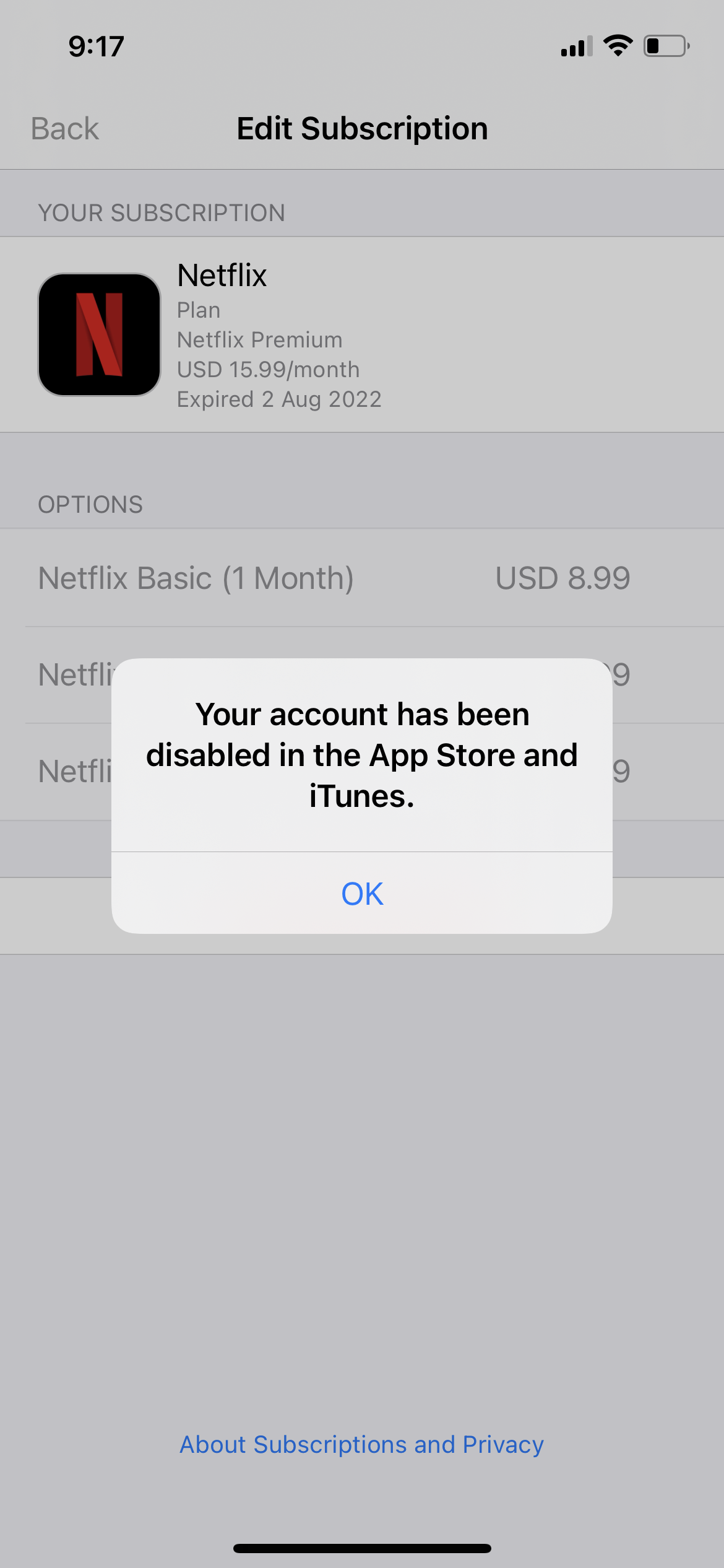 Hello, I try to renew my subscription from my apple ID, while I was renewing it, a prompt message pop up stating “your account has been disable in the App Store and iTunes. Can you please assist?