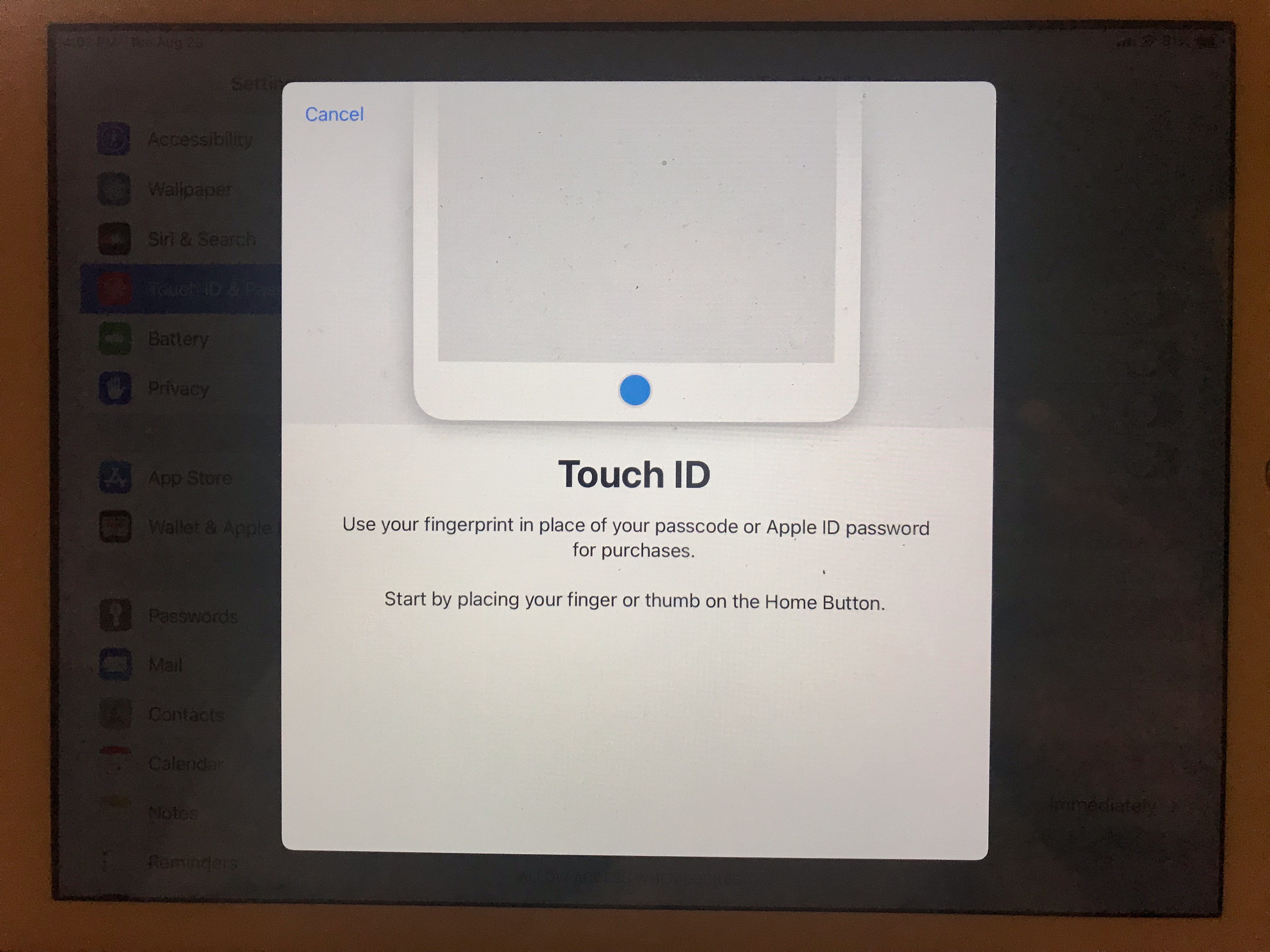 Just updated iPad generation 5 to iOS 15.6.1 and now Touch ID will not allow me to add new fingerprint.
