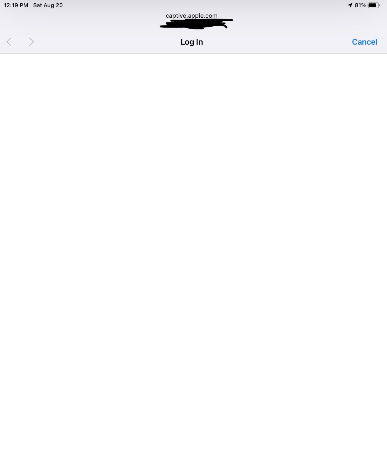 However, using the same network and an iOS device (checked with an iPad Pro 2nd Gen, OS 15.6.1 and iPhone XR , iOS 15.6.1, both the latest updates), the captive.apple.com page pop up appears blank and does not have any visible fields to input password. The user is unable to get past this screen, restricting access to the guest network from any iOS devices. For confirmation, I have successfully connected both devices to the same Linksys router using the main network (access restricted for staff), so the issue does not appear to be the devices or their connectivity.