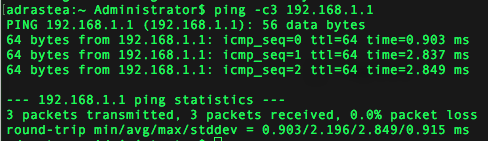 At that prompt, enter: ping -c3 192.168.1.1, and then, press the return key. The results should looks something like the following: