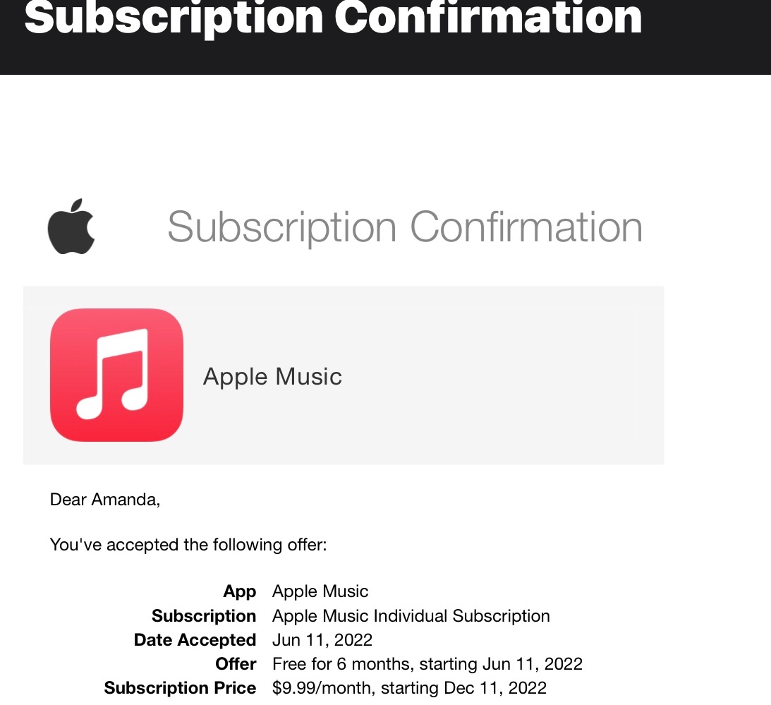 "I got AirPods and subscribed to free 6 months of Apple Music it expires dec 11th but I keep getting charged. Why?? That’s not free: I got AirPods June 11th, subscribed to the 6 months free. The email I received said it expires December 11th. I received a couple of emails of them charging me when my 6 months isn’t up yet? Has that happened to anyone else??? Doesn’t make sense……."