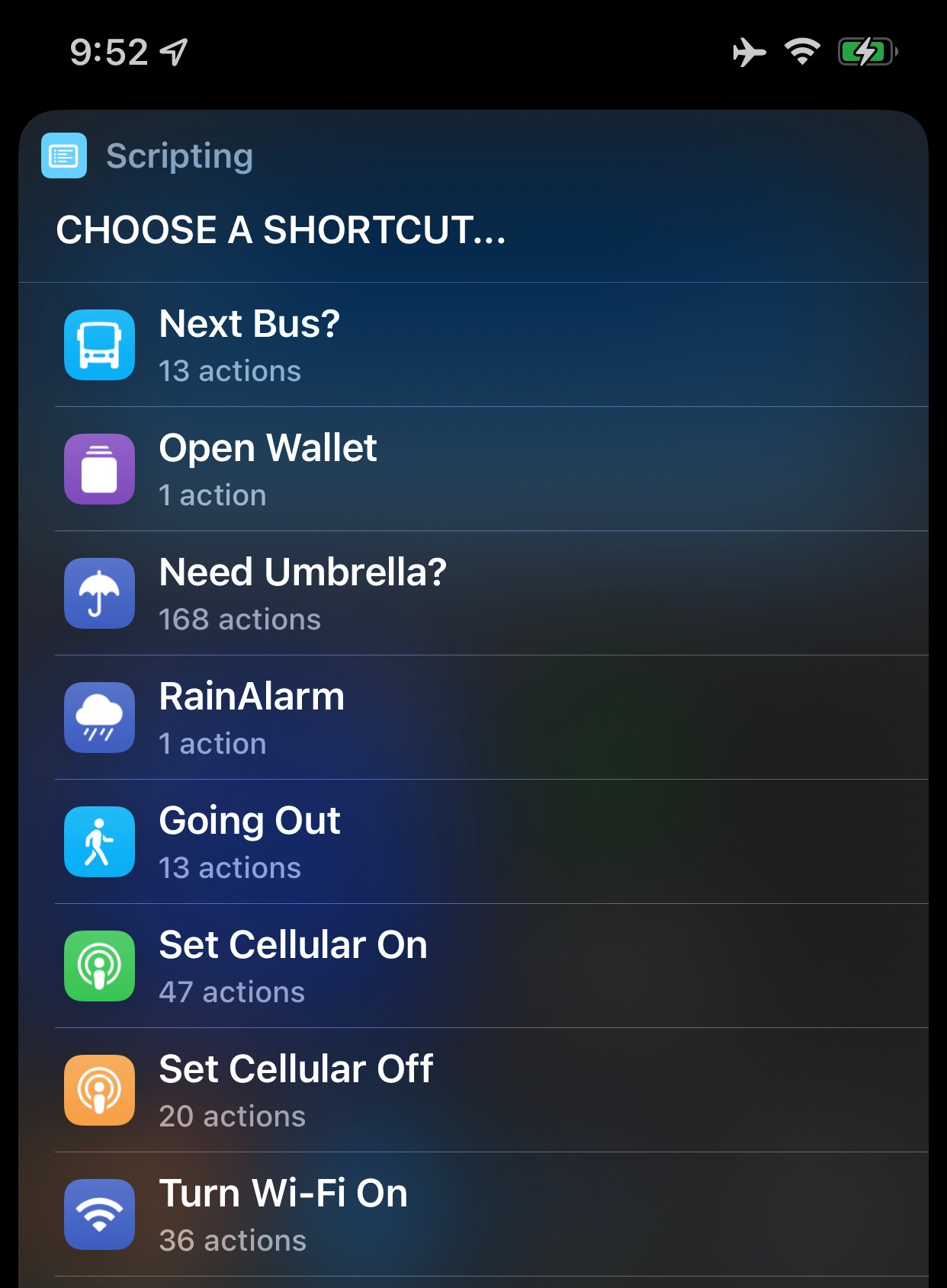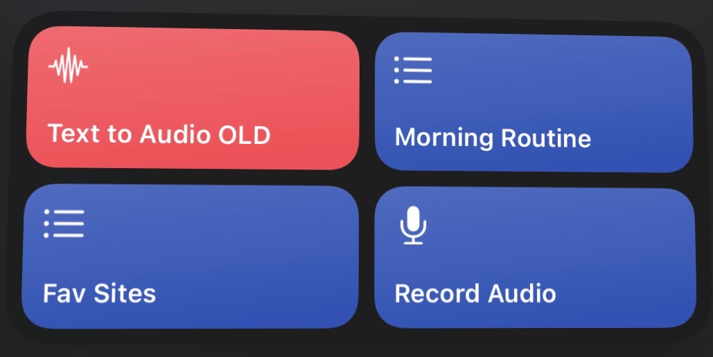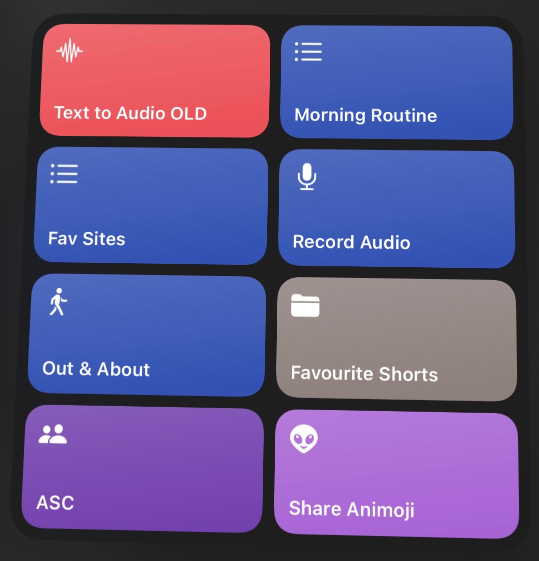 EL ~ Which Control Centre controls does your Mum frequently use? ...Because simple custom shortcuts in Apple's Shortcuts app can probably control some of those. Then you have the option to have big "widget shortcut" buttons on the home screen to control, say, Cellular, Wi-Fi, Bluetooth, etc. Or you could have just a single, big button which displays a menu of controls along with clear word labels. To give you an idea of the possibilities, on my Home screen I have this big "widget shortcut" button I've called Out & About: