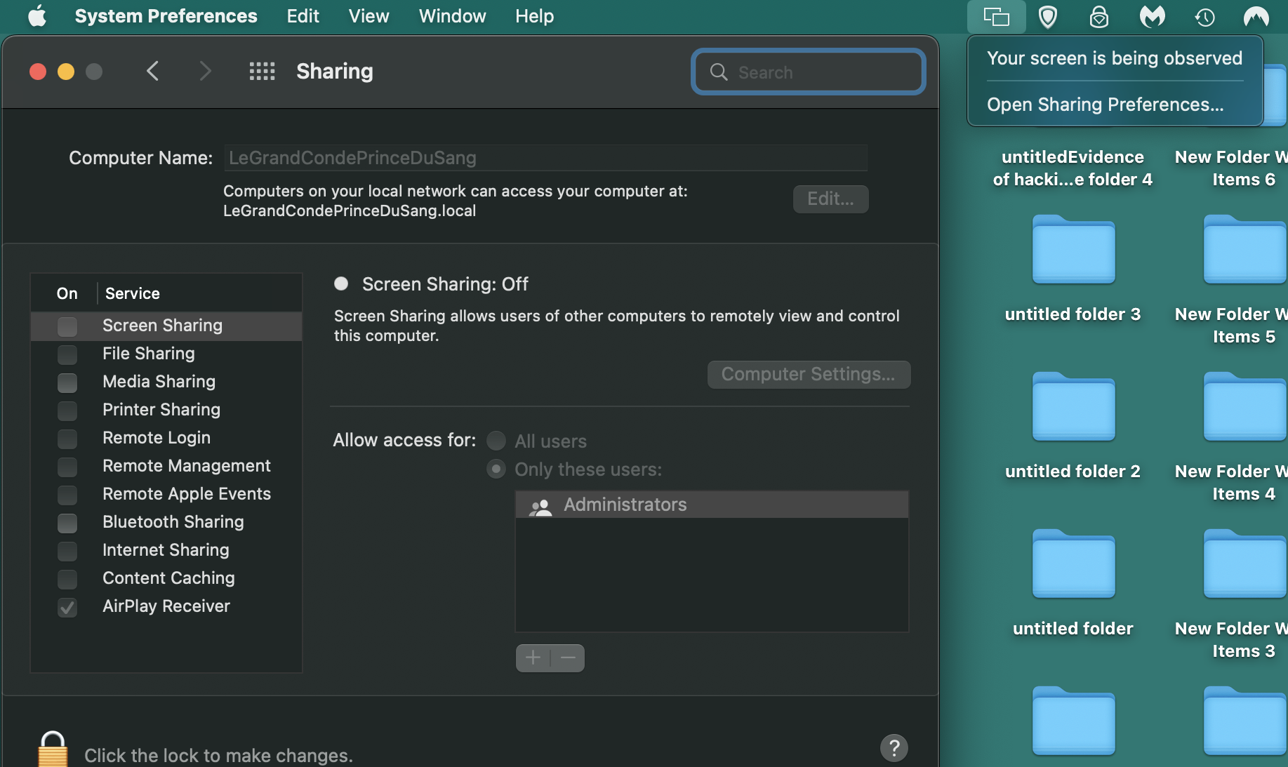 Also, my MacBook shows regularly that my screen is being observed. The problem is that I am not doing any sharing (except Air Receiver, but even then all incoming connections are blocked) and the screen observed happens is showing up when I open the laptop first thing in the morning.