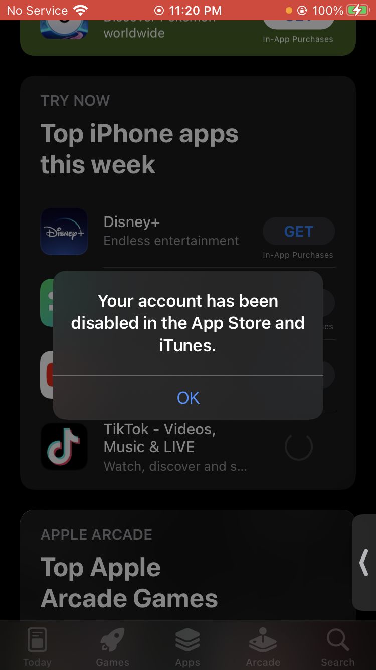 If you see a message that says 'Your account has been disabled in the App Store and iTunes' - Apple Support.   *