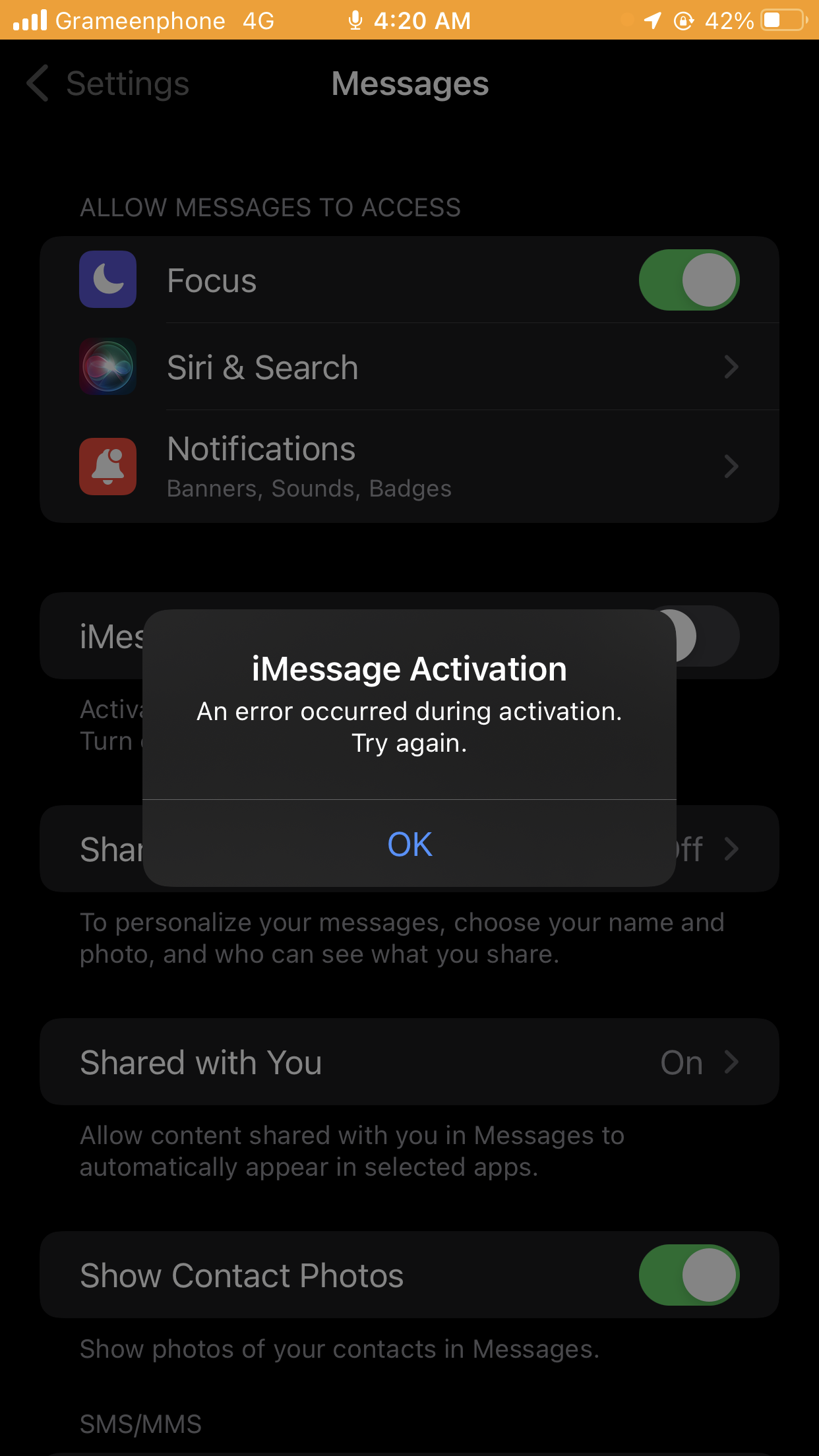 When I tried to activate iMassage/FaceTime it says "An error occurred during activation please try again." I tried each & every method but My iMassage/FaceTime isn't activating. I tried Changing Region, Time and Date. Also tried using cellular Data & Wi-Fi but still doesn't Activate. I'm seeking for help. Please tell me if there's any solution for that. My device is iPhone 8 Plus
