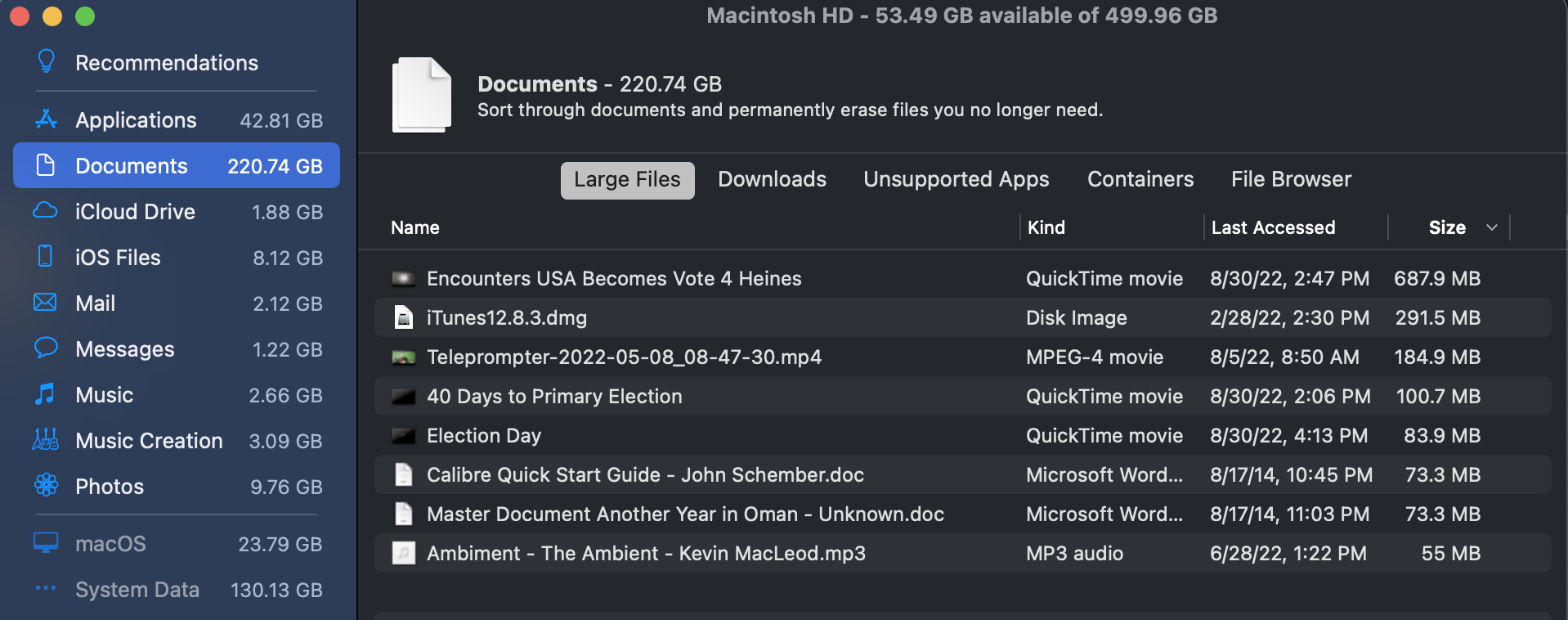 I am editing a movie in iMovie. I have edited a few documentaries already, but it appears even if I delete files from iMovie they not only don't go away, there is no way to find them to delete them. I cannot tell what is taking up all my space in my documents either. Since I can't seem to be able to open iMovie from an external drive (Lacie), that option isn't there.