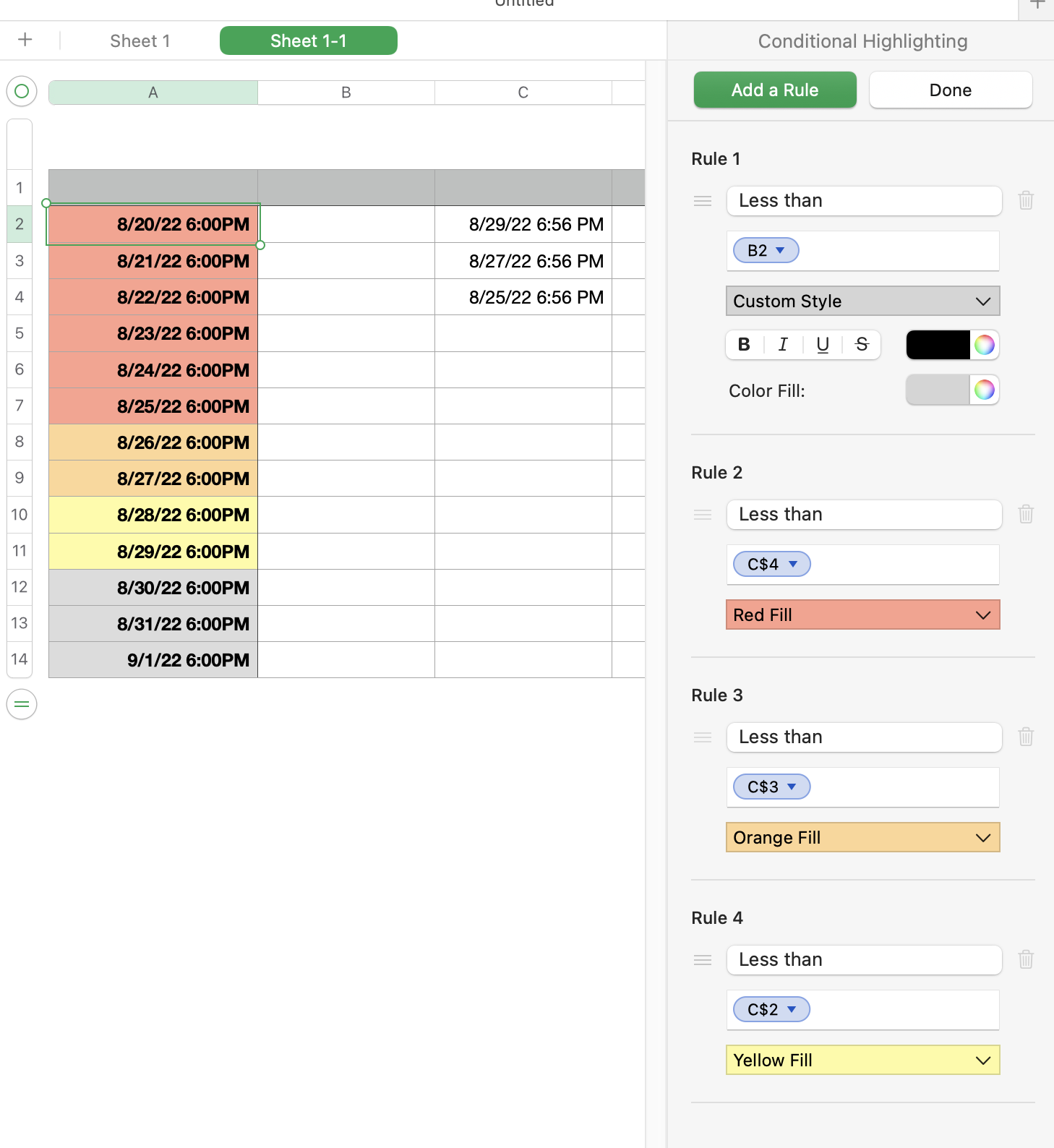 Hello Numbers users. I am trying to figure out if it is possible to do conditional highlighting using dates & durations without needing to add a dedicated column, as my spreadsheet has a lot of columns already and I can't add yet another one.