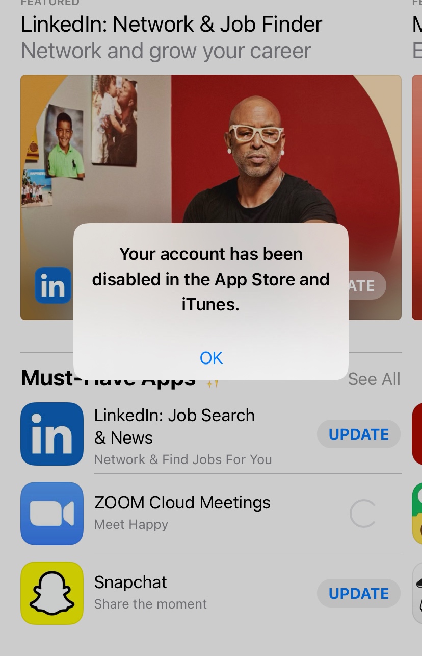 If you see a message that says "Your account has been disabled in the App Store and iTunes," contact Apple Support for help.