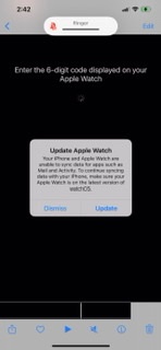 after the initial pairing messages on both devices, the iPhone is prompted that the watch needs to update to continue pairing. However you proceed from here, the below message/screenshot will eventually occur.