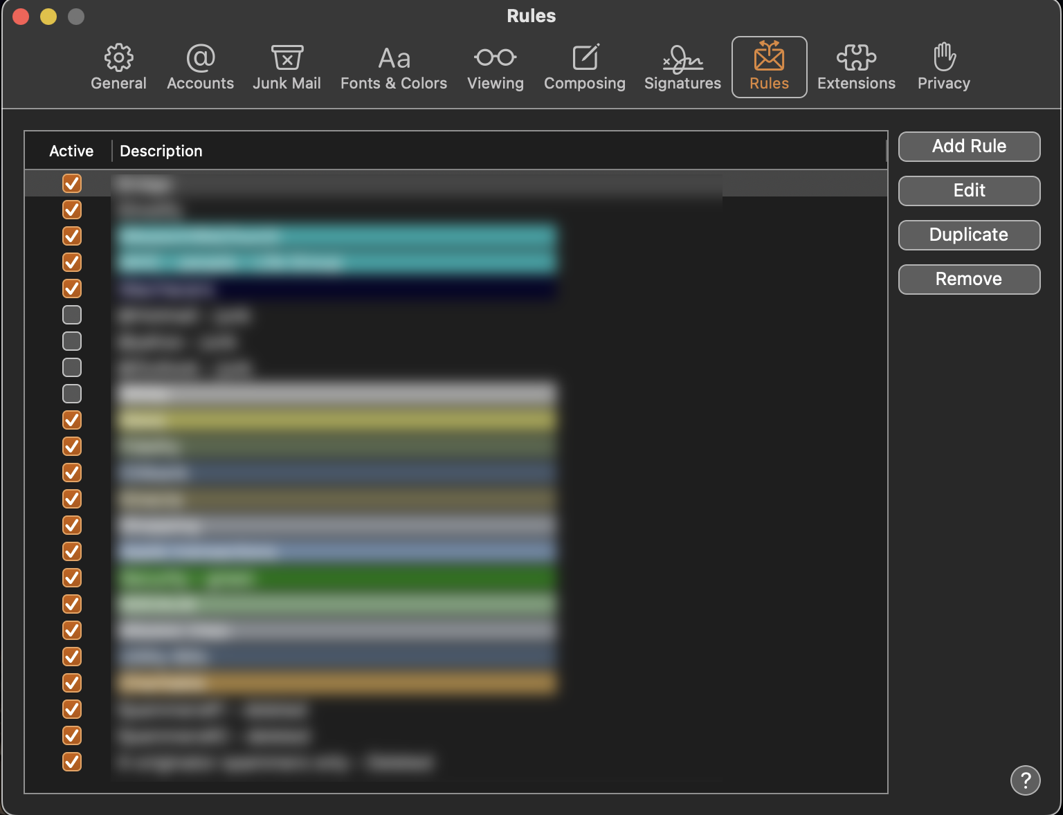 I request that the preference for mail rules permit a search for a pattern in the open rule set. Or at least permit a sort of the different items so you have hopes of finding the desired item. I have an extensive rule set - compiled over many years - I have a terminal script to review my (sorted) rules, but it's very difficult to find the matching rule In the mail.app. I need a search/sort. Of course it would be convenient if there was a way to move a rule item up or down so I could sort them as is permitted it the main rule page.