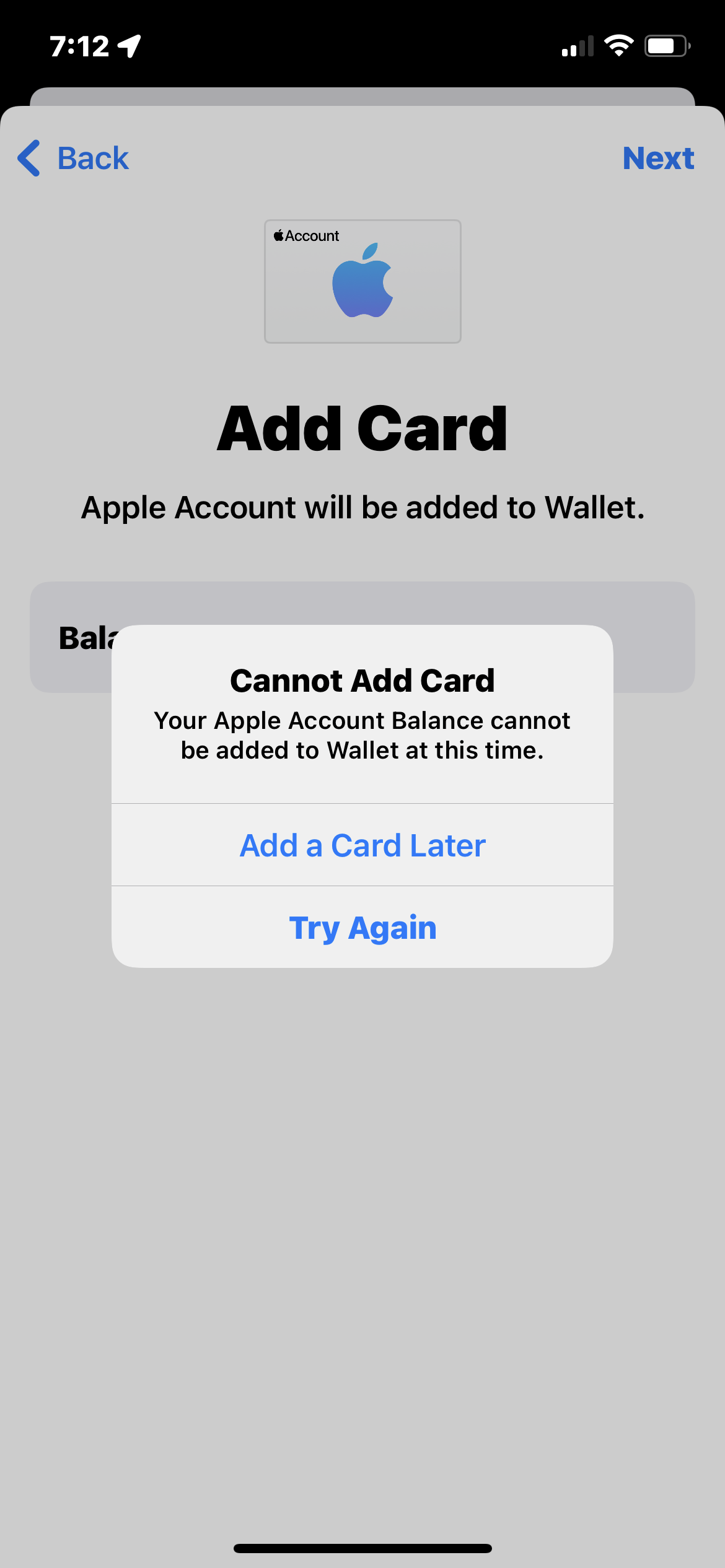 It won’t let me add my apple account to my wallet and it keeps giving me the same error (Your Apple Account Balance cannot be added to Wallet at this time.) even when I try it hours later.