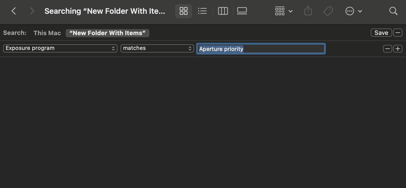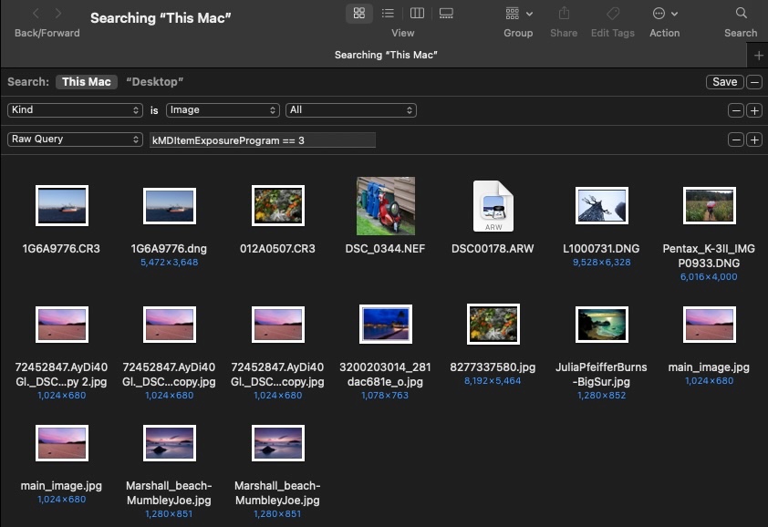 I have a batch of photos shot in various modes (Manual, Aperture priority, shutter priority etc..) When I search through them by exposure program, Finder doesn't see them. I've tried tinkering the search parameters to no avail. I know that the files are indexed because when I search for them by name they show up and if I search by any other parameter aside from Exposure program they show up. Any suggestions?
