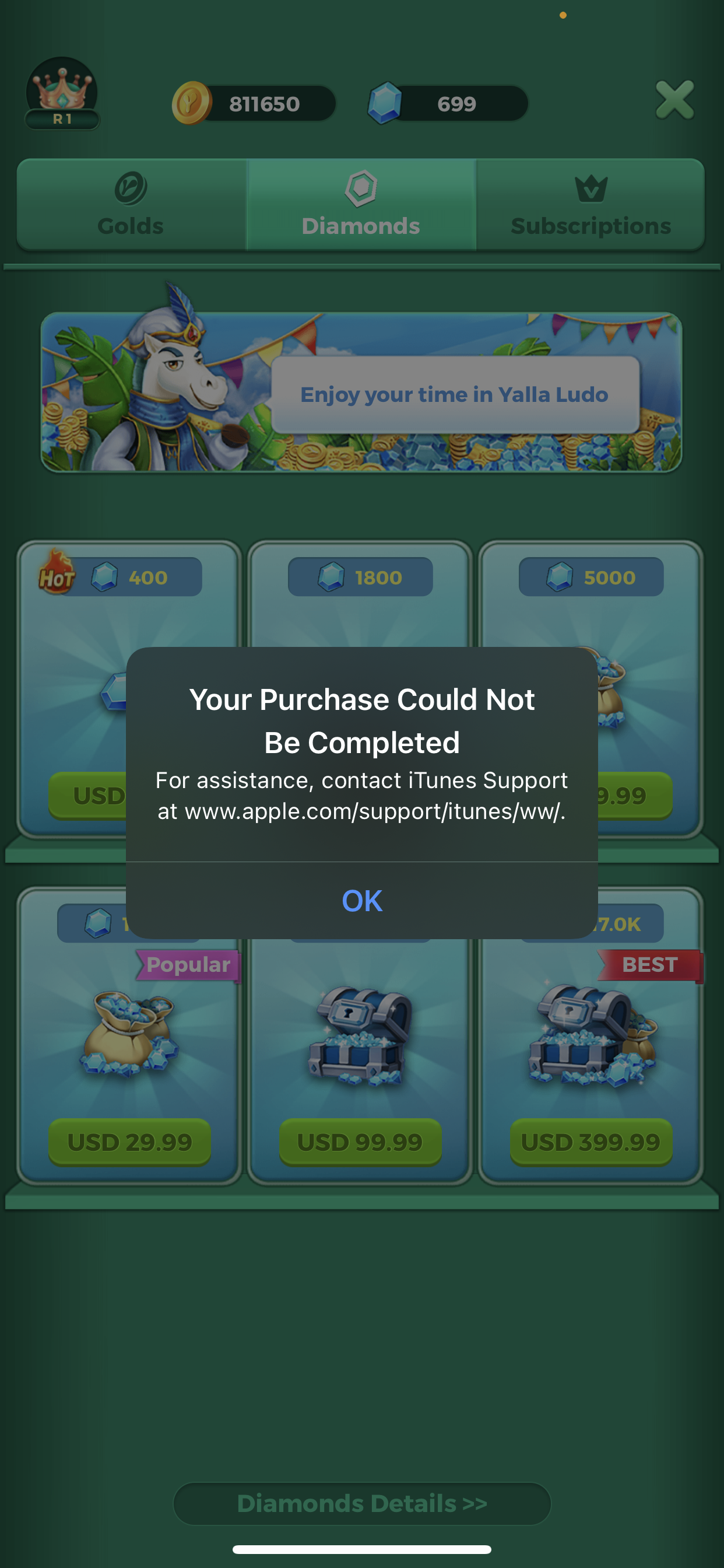 I’m trying to buy diamonds in the LUDO game from ITunes and I have enough money but it is not going through. It is saying to contact iTunes support!