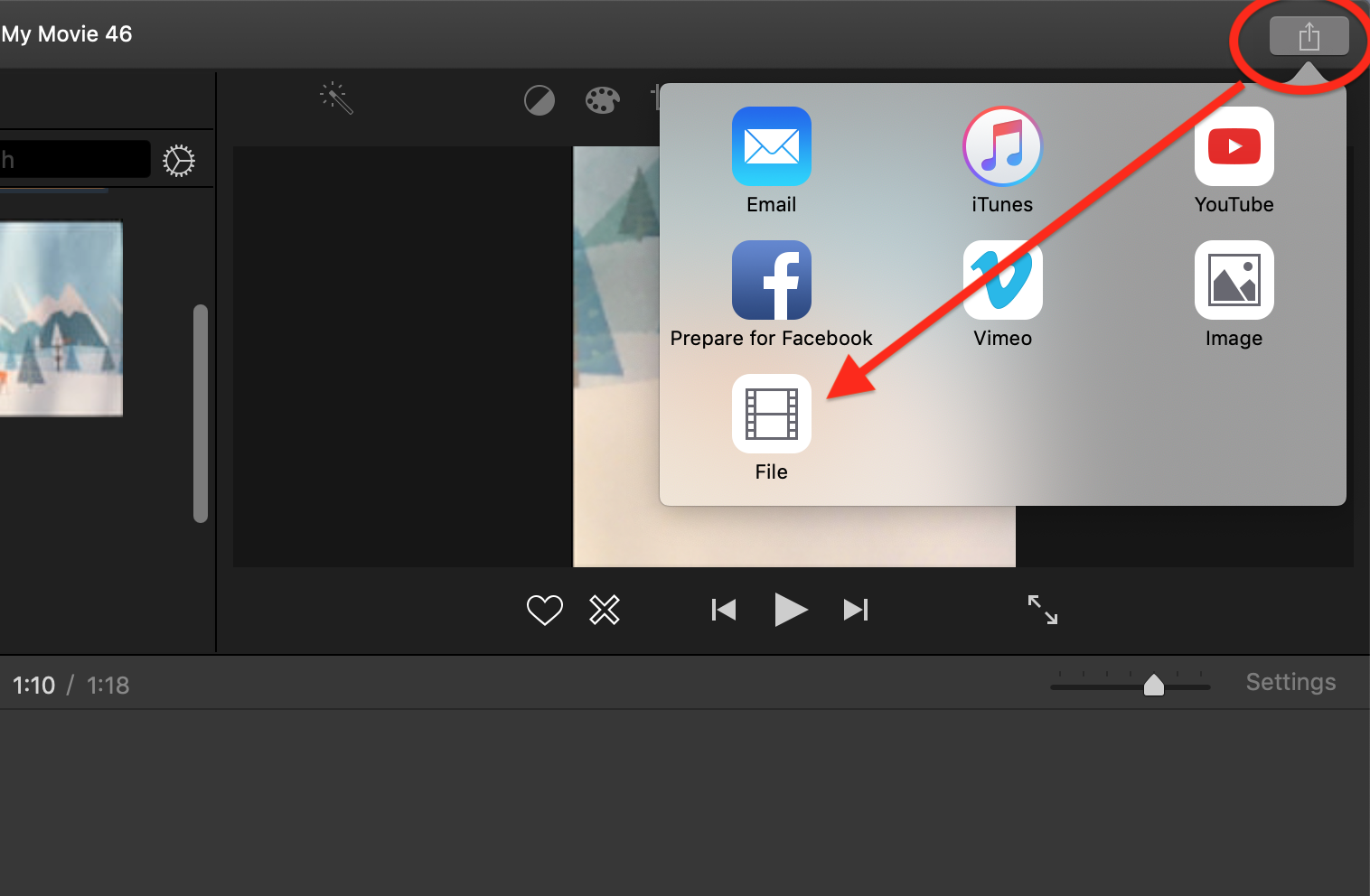 Export the movie to your desktop by clicking on the share button (the square with the upward pointing arrow in it) in the upper right hand corner of the iMovie project window, and then click on the File icon in the option box that appears.