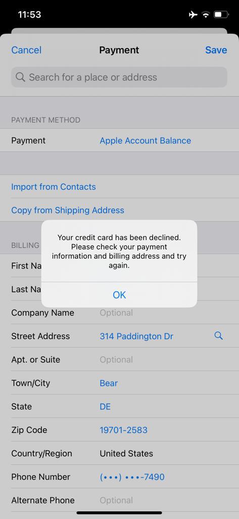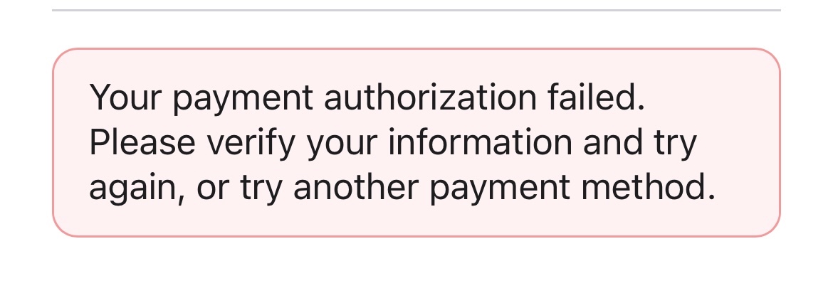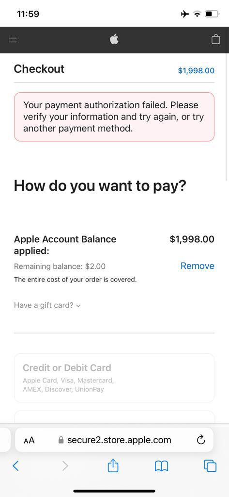 I'm attempting to use my Apple Account Balance to partially pay for an order. My credit card covers the remaining balance. I'm unable to do so and I keep getting "Your payment authorization failed. Please verify your information and try again, or try another payment method." error.