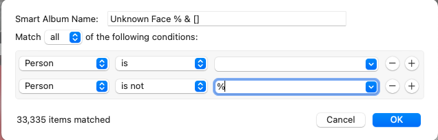 Like a few posts which I have seen on this forum I am trying to weed out the unknown faces. I have followed the advice started in this blog & a further condition found here. Essentially saying to create a one condition where the “Person” is set to the empty string. The second contain which is it the person not being equal to % yielded no extra results for me. The conditions are shown below in the figure.
