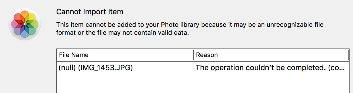 Can't import photos gives me an error message