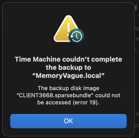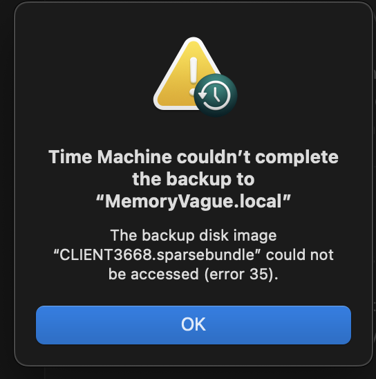 I had a Time Machine backing up to a Synology share mounted on my Macbook running OSX12.6 .This was working perfectly, right up until around the time I upgrade to Monterey. Apparently it started to fail silently in the background until I noticed and tried to force it to backup and started getting the error message: "Time Machine couldn't back up to.. "