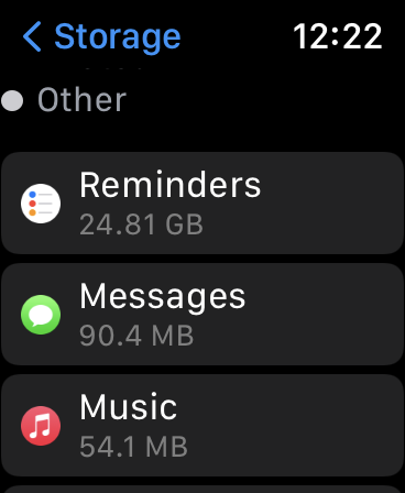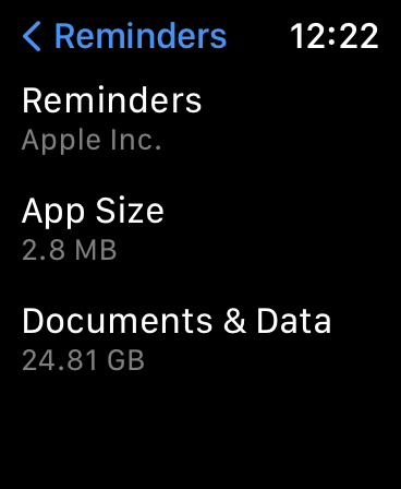 My 32 GB watch is full because the Reminders App Data is taking up 30GB. I’ve deleted the reminder (there was only 1) and all completed reminders. I’ve deleted the app. I’ve restarted my phone and watch. I’ve re-installed the app and nothing has any affect on the size the data for the app. It’s driving me nuts. I haven’t reset me watch and phone because I’m currently away and can’t back them up.