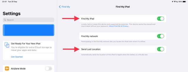 Settings > [Your Name / AppleID] > Find My > Find My iPad >