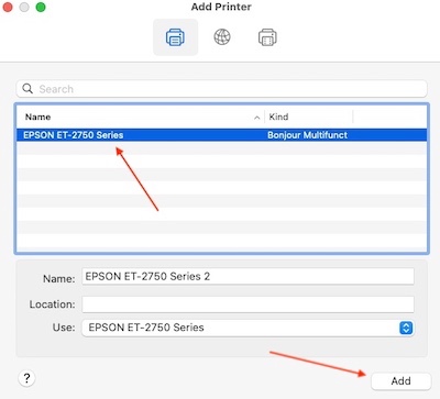 When clicking the plus + to add my wireless printer I it only recognises the name (Brother DCP-J315W), and the soort (Bonjour). However nothing under location, and use.