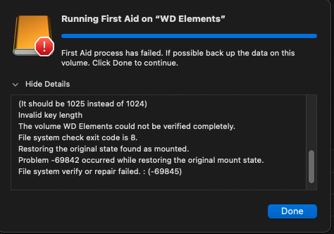 I have a WD elements 4TB External drive that is giving me the click of death and this error message when I mount it: