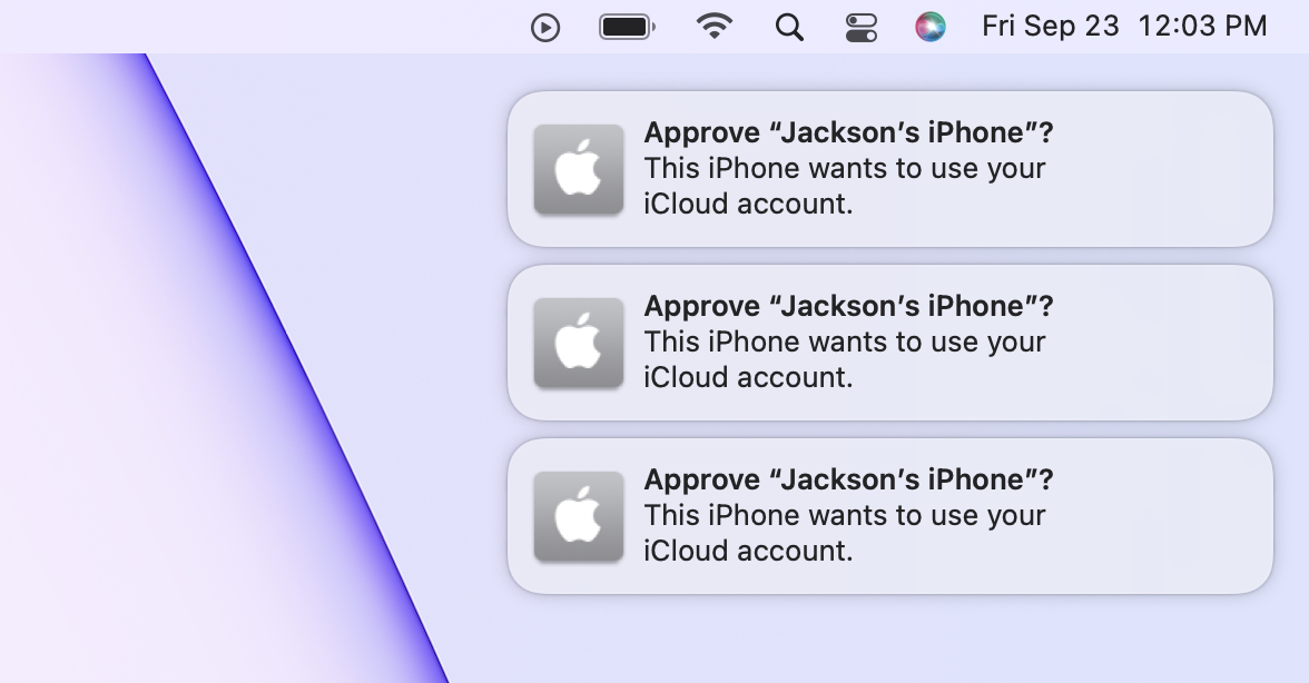 Hello! I recently upgraded and got both a new MacBook Pro (13", M2, 2022) and iPhone 13 Pro. Ever since I've been using both, my Mac incessantly asks me with a notification in the upper right to "Approve "Jackson's iPhone"? This iPhone wants to use your iCloud account."