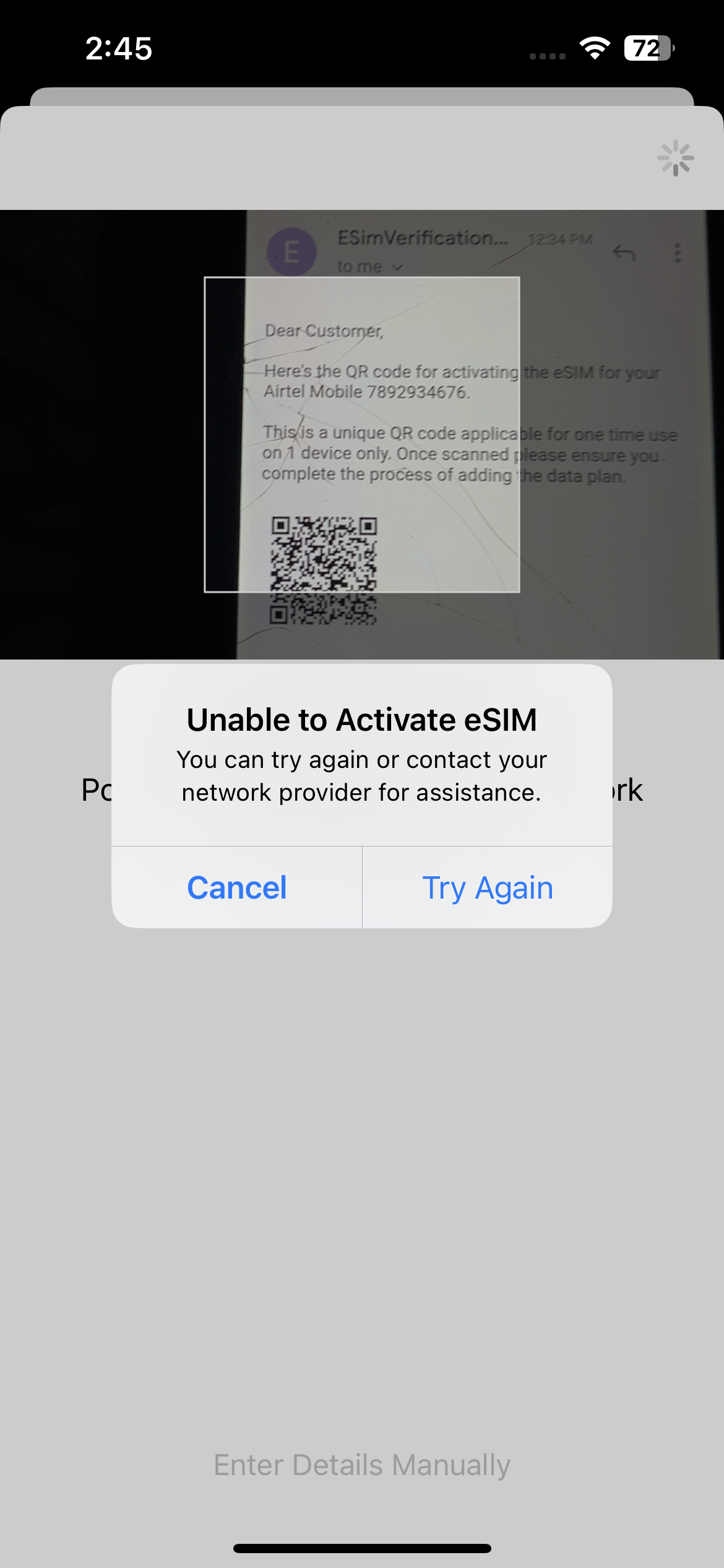 I have done the whole eSIM process given at https://www.airtel.in/esim more than 10 times now. But receiving following error.