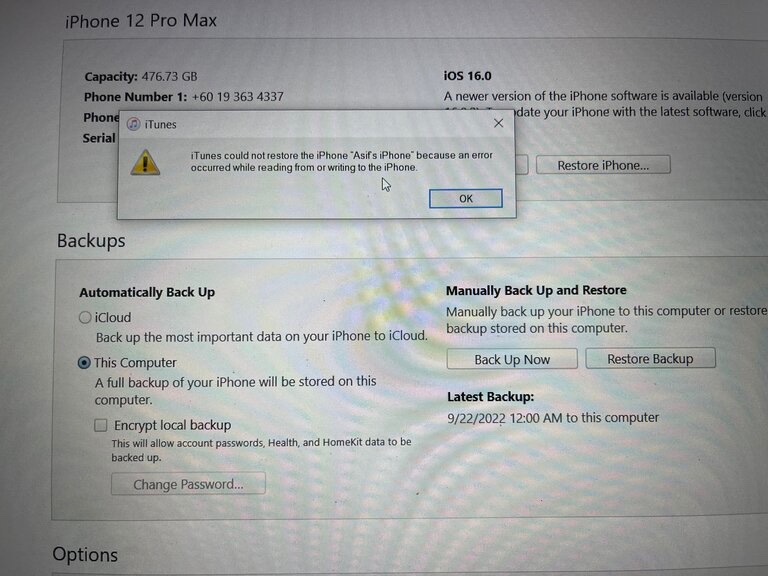 Hello dear Apple support team i am asif from malaysia i need restore my backup from itunes but this error coming almost 20mnt after started of backup, then please help me what should i do now i have already changed my usb type c lightning cable 2 times