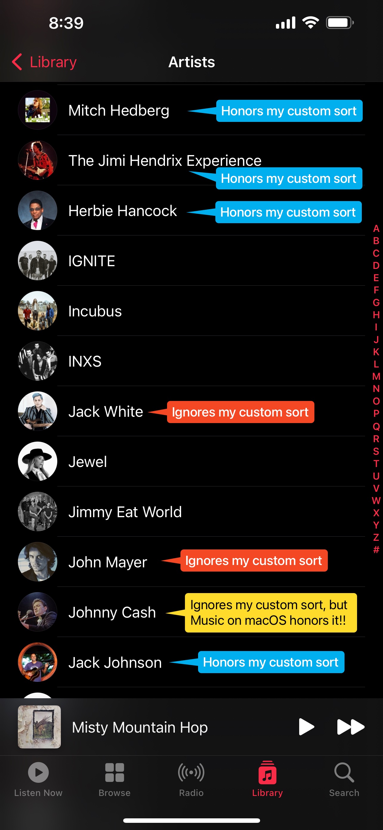 So anyway, now I am finding that Apple Music only honors my custom sort fields when it feels like it, and it changes within the same app (macos Library->Artists view vs. Library->Albums view) and across platforms (macOS vs iOS).