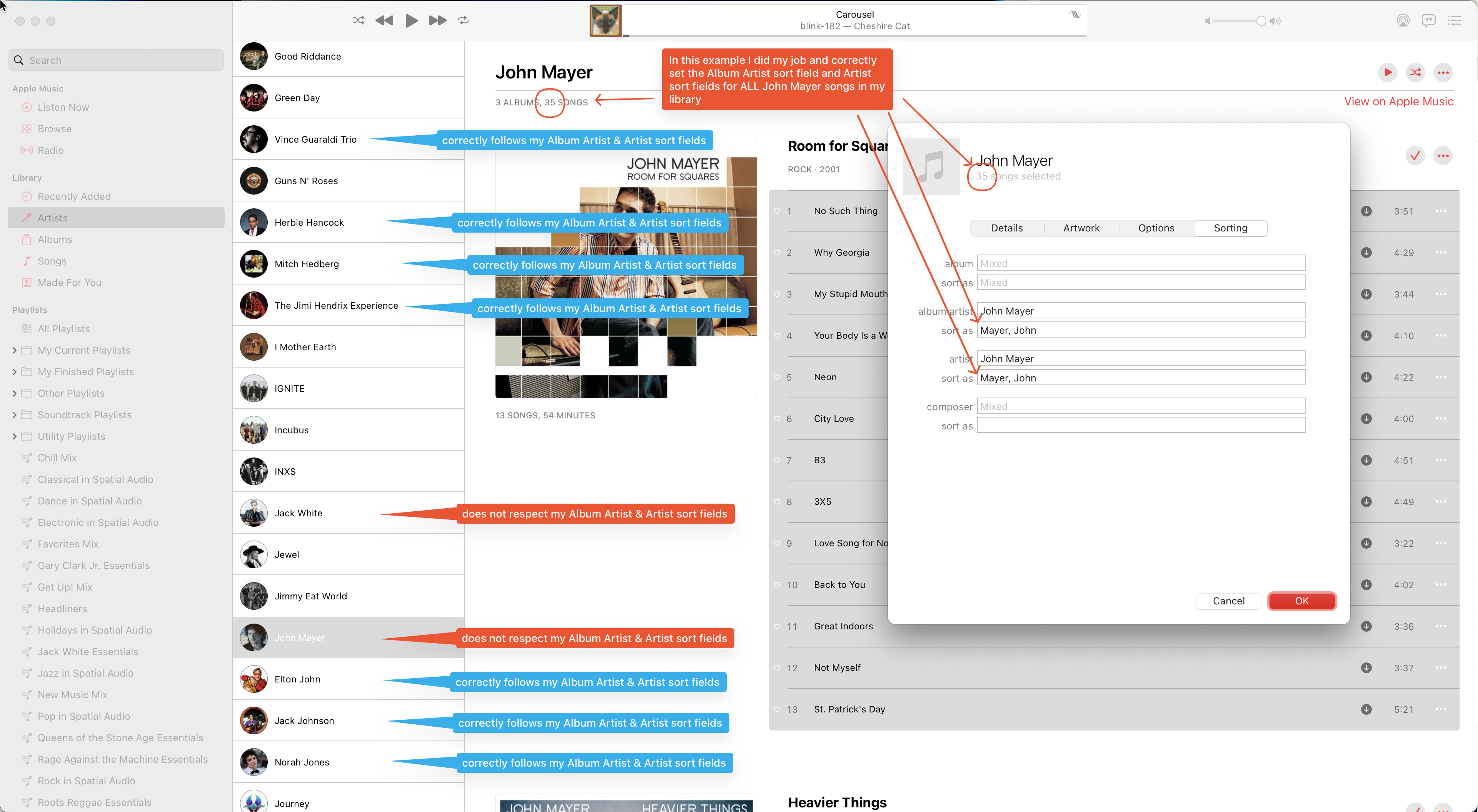 Here I demonstrate Apple Music's Artists view inconsistently honoring my custom Album Artist sort data. First on macOS: